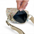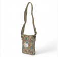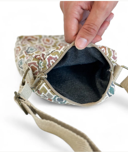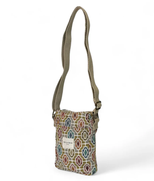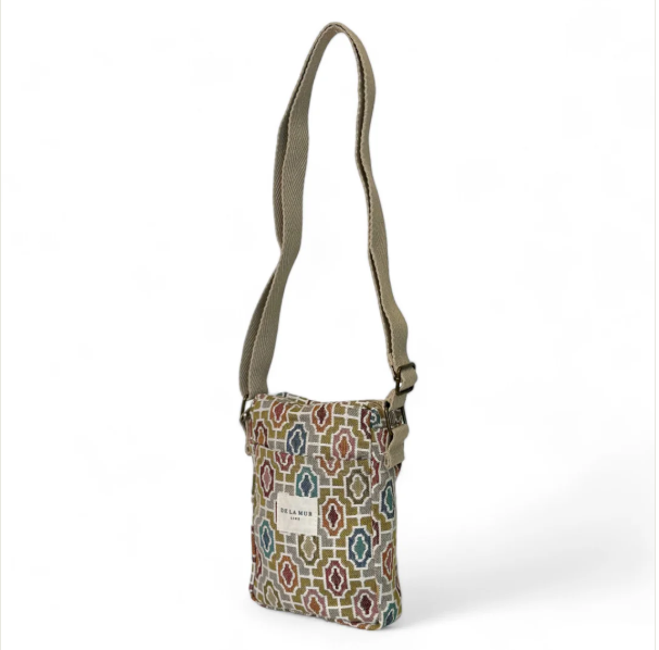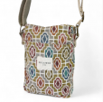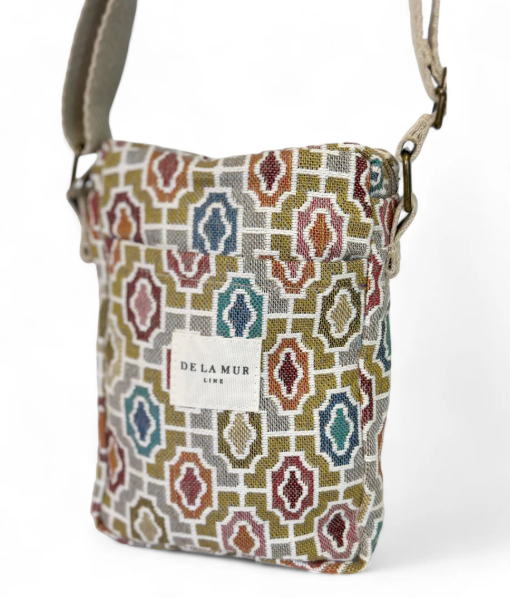 Bolso porta móvil para llevar tipo bandolera, con cremallera en la parte superior y asa larga ajustable de cinta de espiga de algodón de color beige. Bolsillo sin cremallera en la parte exterior. Con tejido grueso de jacquard con estampado geométrico en tonos beige, rosa y azul. Forrado de tejido grueso de color gris en la parte interior. Para su correcto mantenimiento se aconseja lavarlo en frío a mano y no utilizar secadora.