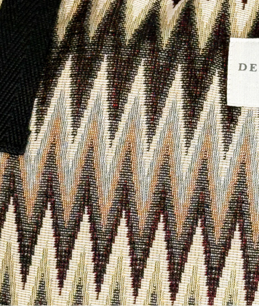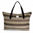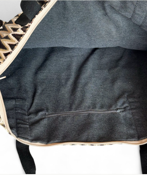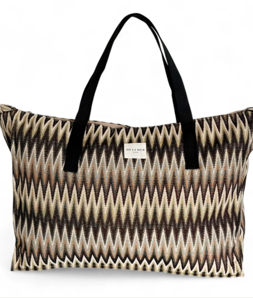 Bolsa de fin de semana con asas medianas en la parte superior de cinta de espiga de algodón de color negro. Con tejido grueso de jacquard con estampado tipo zigzag en negro, beige y crudo. Cierre superior con cremallera. Bolsillo interior con cremallera. Forrado de tejido grueso de color gris en la parte interior. Para su correcto mantenimiento se aconseja lavarlo en frío a mano y no utilizar secadora.
