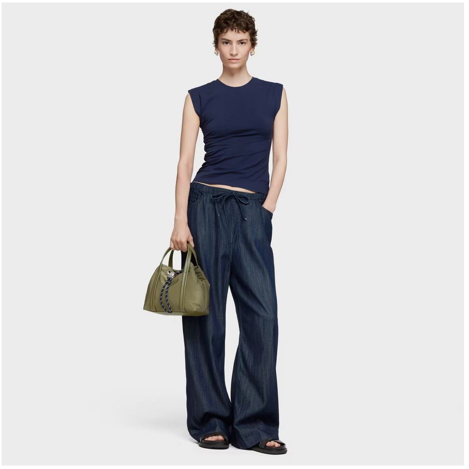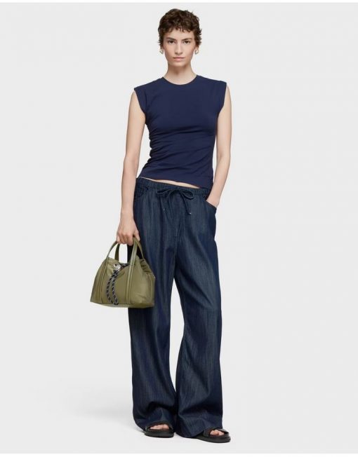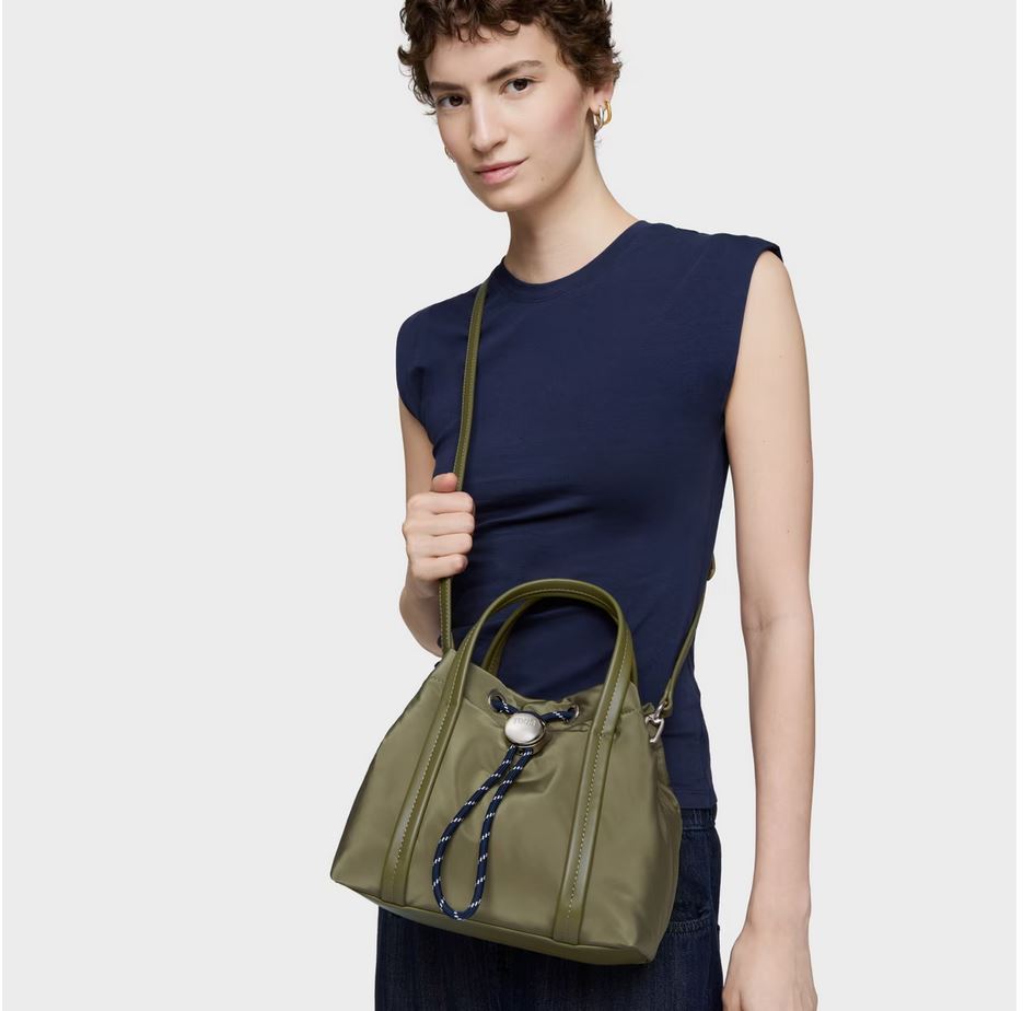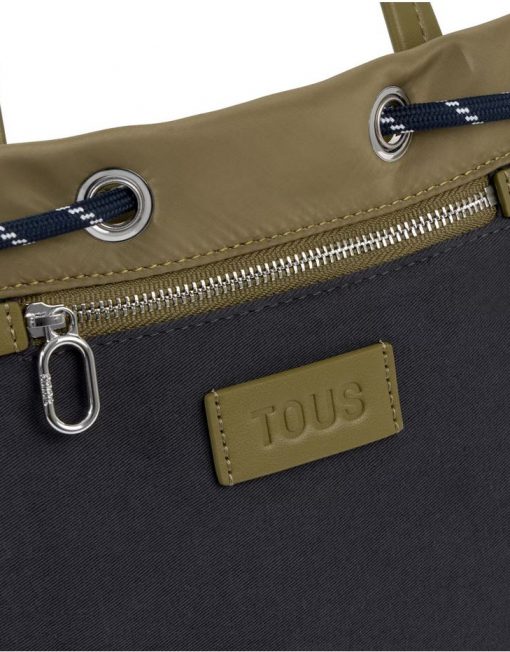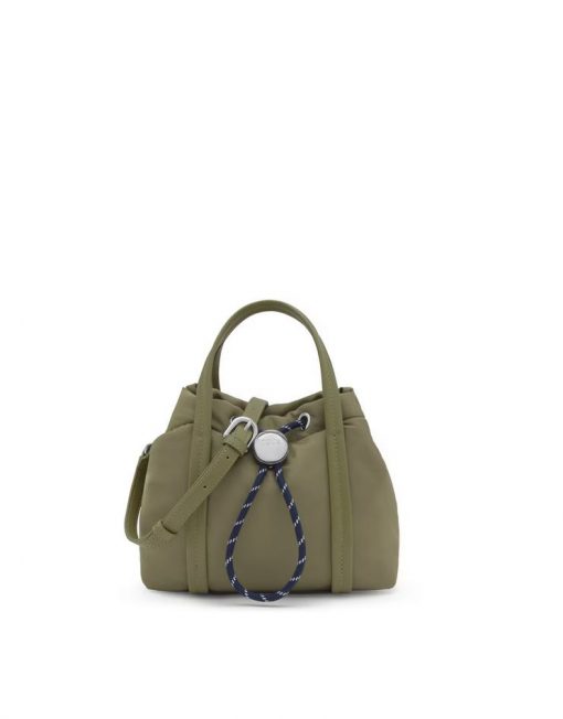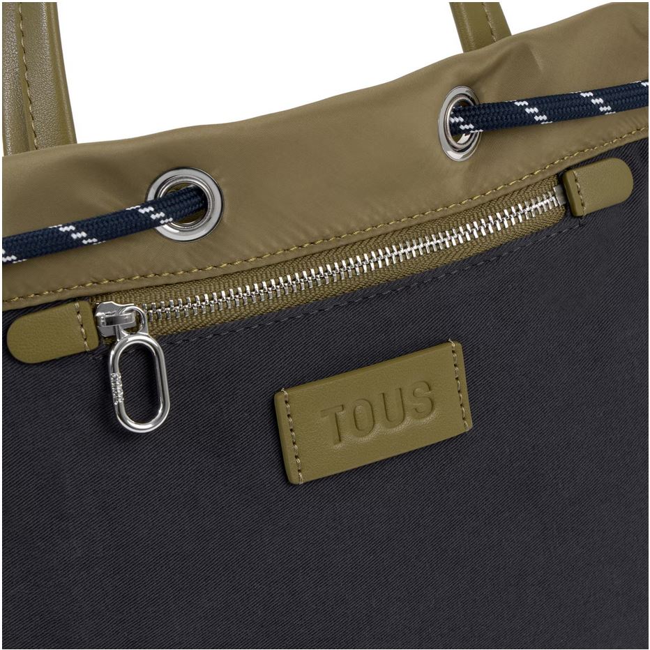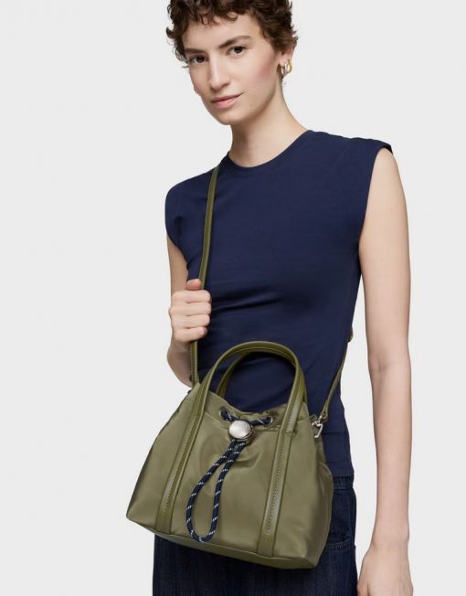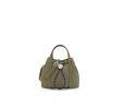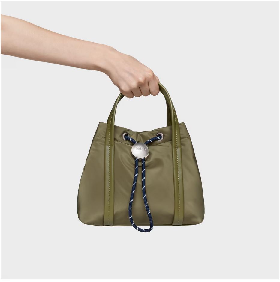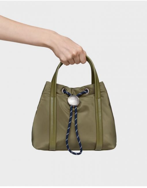 Bolso bombonera Empire Soft de poliéster reciclado con detalles de poliuretano en color verde oliva. Cierre con cordón ajustable. En el interior incluye un bolsillo. Asas fijas de mano y asa bandolera ajustable y desmontable. Medidas (alto x ancho x fondo): 21 x 24 x 10 cm.