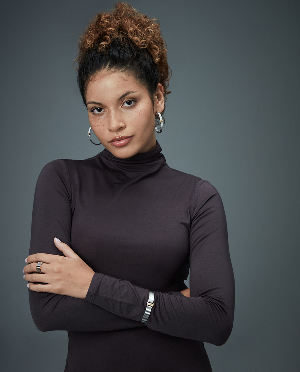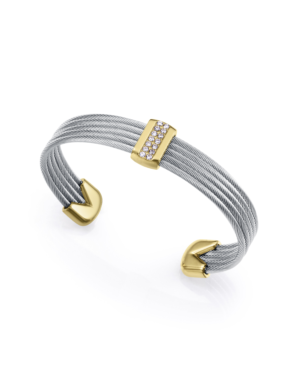 Una pulsera que irradia modernidad y elegancia con un diseño único. Fabricada en acero con acabado IP dorado, presenta múltiples cables unidos por una barra central, creando un efecto dinámico y fluido que le da un toque contemporáneo. Las circonitas blancas engastadas aportan un brillo sutil y sofisticado, realzando la pieza con destellos luminosos. Con un diámetro máximo de 5,8 cm, se ajusta cómodamente a la muñeca, convirtiéndola en un accesorio versátil y elegante para cualquier ocasión. Ideal para mujeres que buscan un diseño moderno con un toque de distinción y elegancia atemporal.
