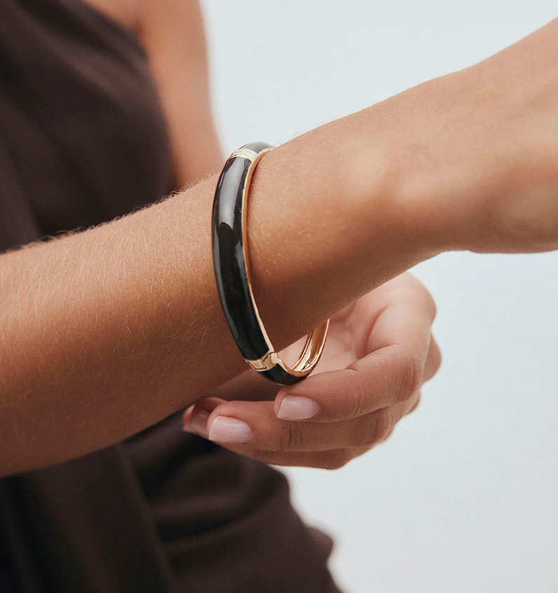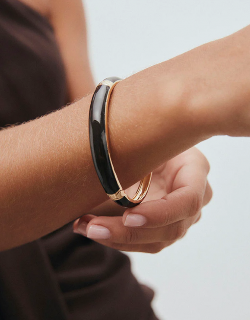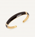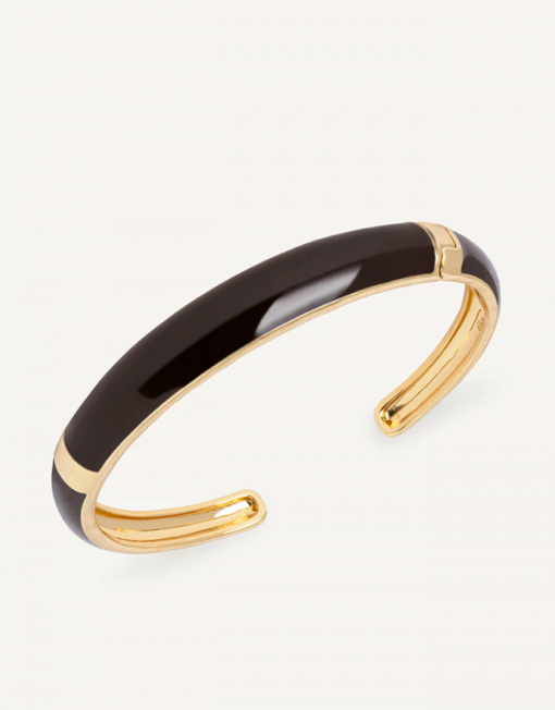 Brazalete escultórico Intervalo bañado con una gruesa capa de oro macizo de 18 kt, lo que garantiza una mayor durabilidad. Tiene un medida de 60 x 50 mm. Destaca por la piedra Esmaltes en tono marrón chocolate, color protagonista de la temporada, que aporta textura, brillo y un gesto de estilo propio.