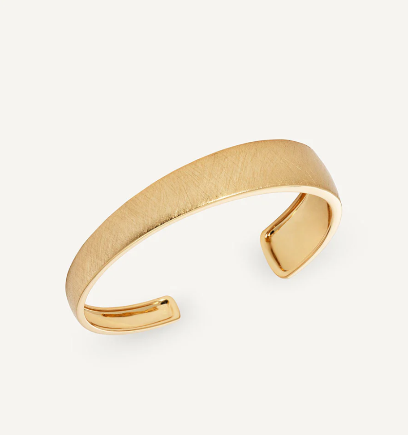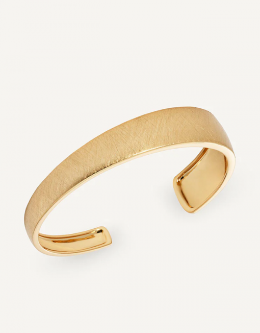 Brazalete rígido textura Arc bañado con una gruesa capa de oro macizo de 18 kt, lo que garantiza una mayor durabilidad. Tiene un diámetro de 50 x 60 mm.