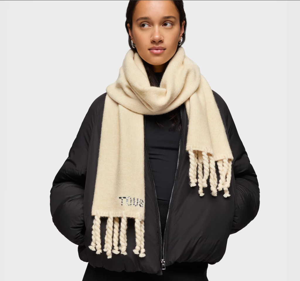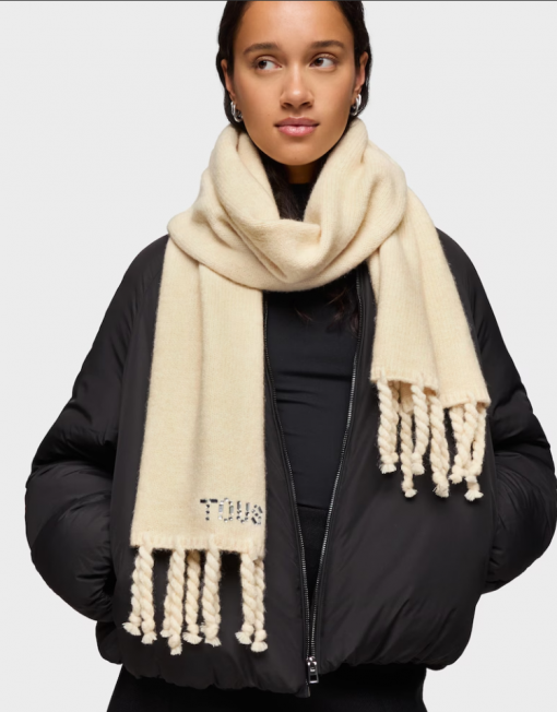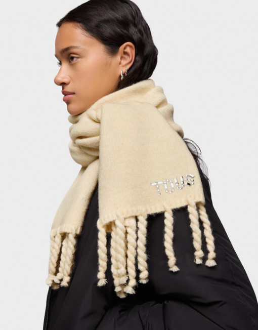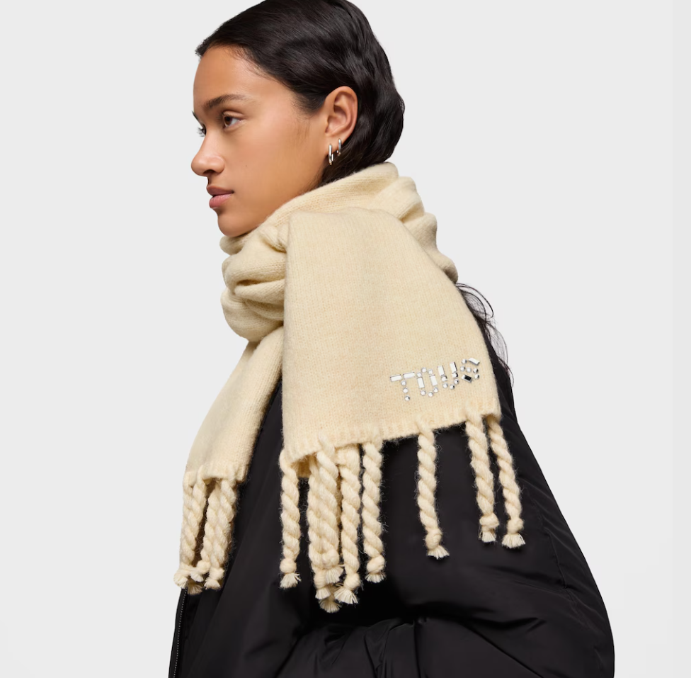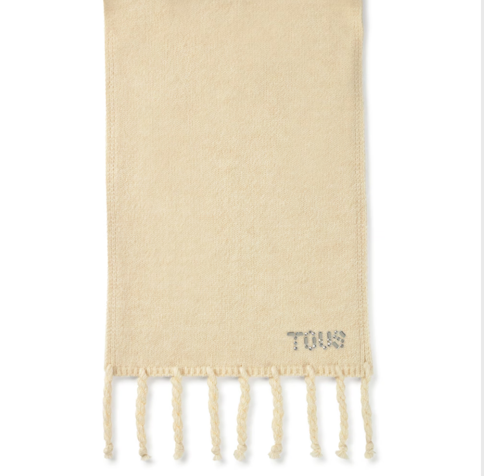 Bufanda TOUS Crystal en color beige. Medidas: 200 x 35 cm. Composición: 50 % poliéster reciclado, 30 % poliéster, 11 % acrílico, 6 % lana y 3 % spandex.