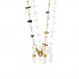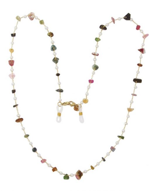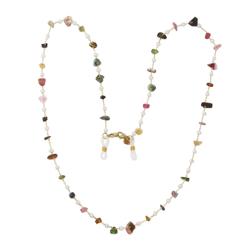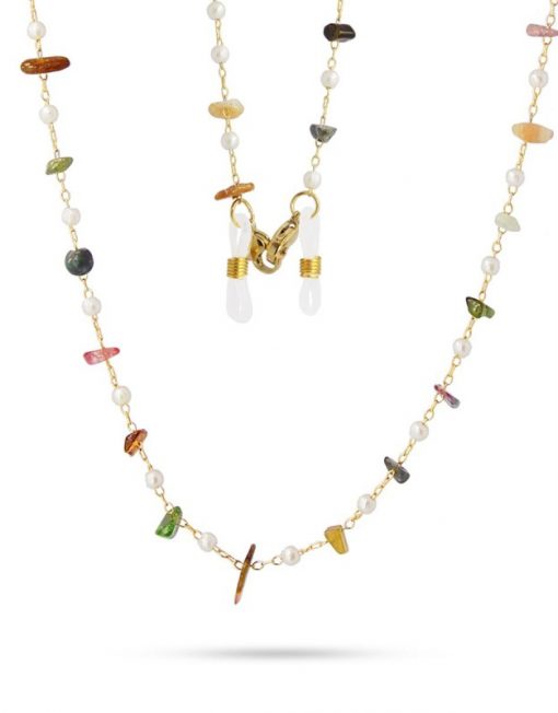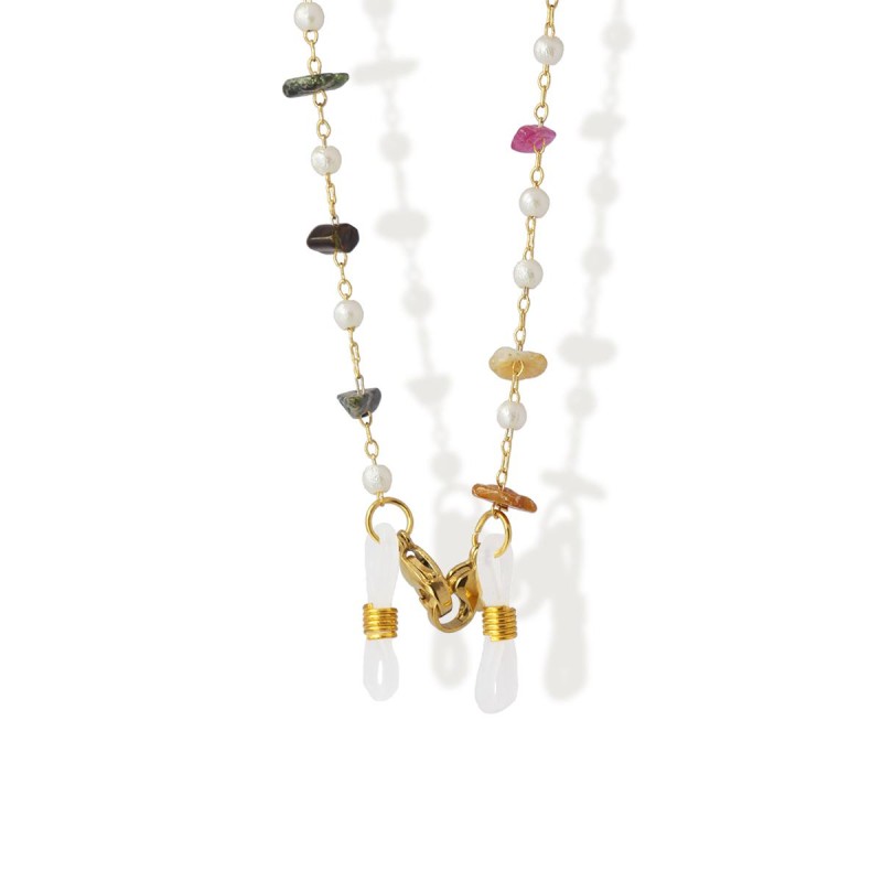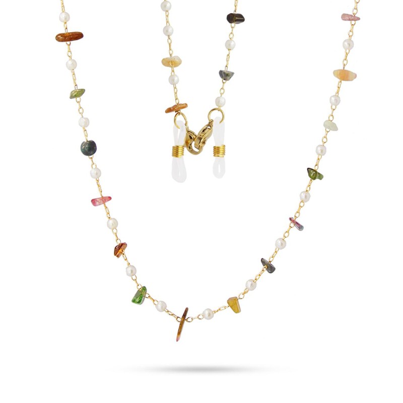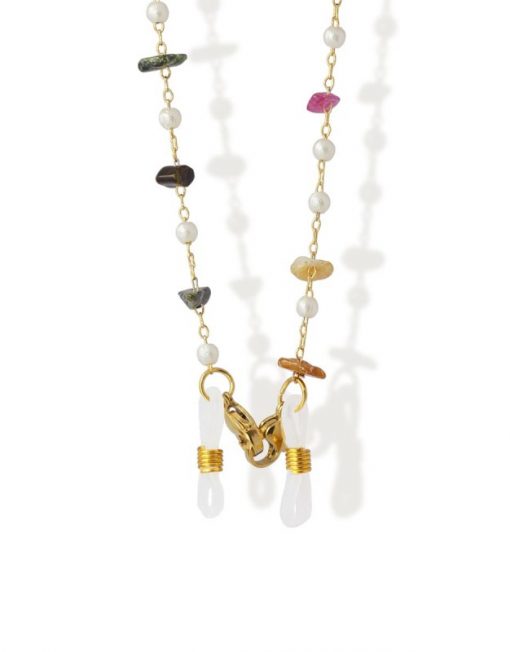Cadena de acero quirúrgico con cuentas que combinan la piedra natural coloreada y las perlas. Perfecta para sujetar tus gafas, tu mascarilla o tu smartphone, gracias a sus cierres de goma o tipo langosta. También lo puedes llevar como collar con una o dos vueltas ya que mide 75 cm de largo. Versátil y muy práctica puede convertirse en el regalo perfecto para ella.