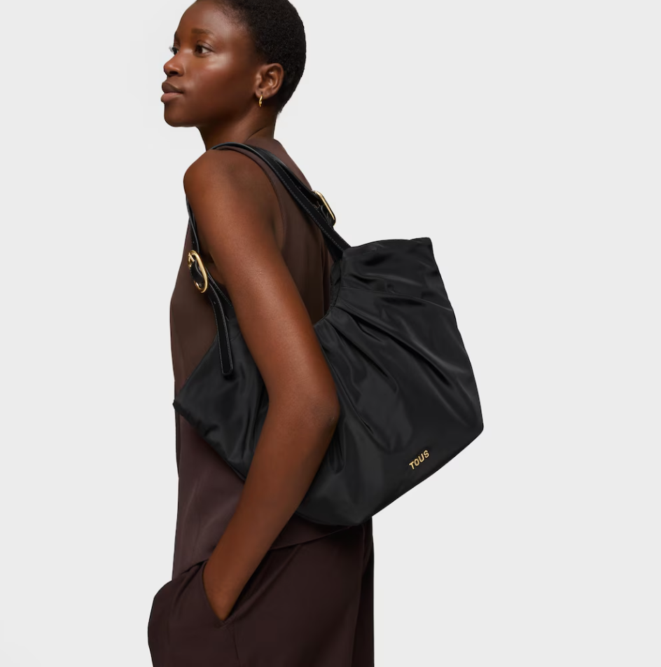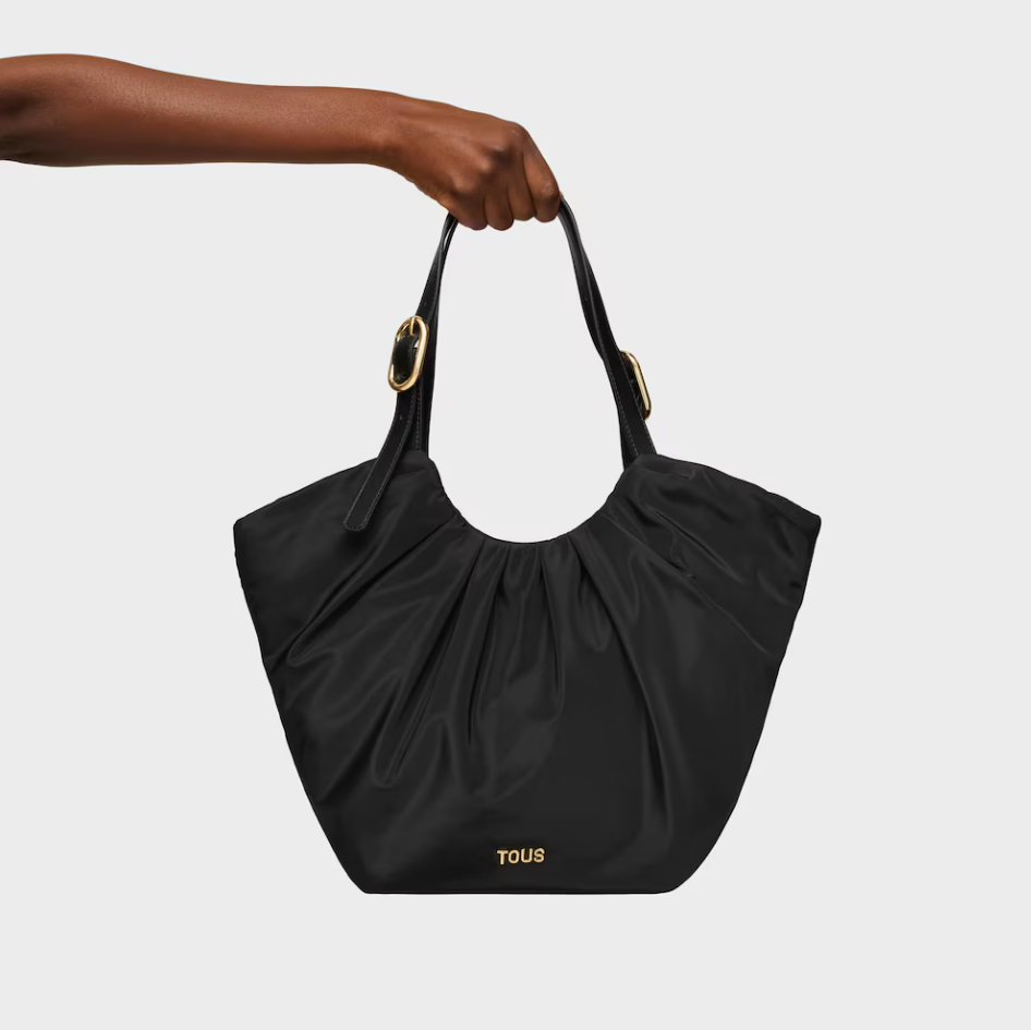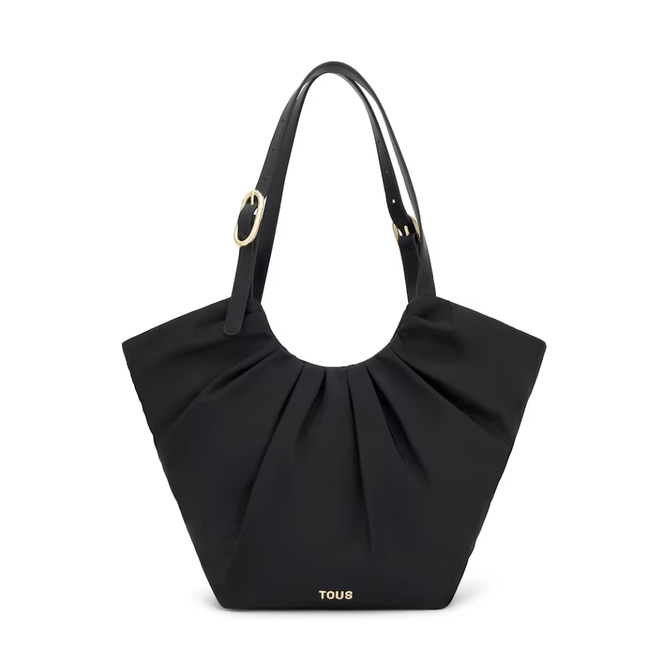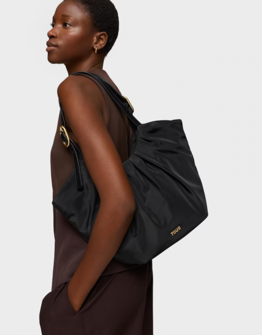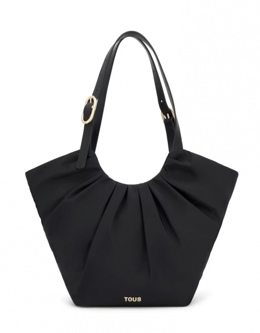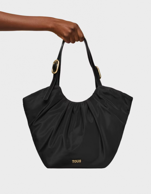 Bolso capazo mediano TOUS Travel de poliéster reciclado con detalles en poliuretano de color negro. Cierre cremallera. Bolsillo interior con cremallera. Asas fijas de hombro. Medidas (alto x ancho x fondo): 10 x 45 x 33 cm.
