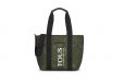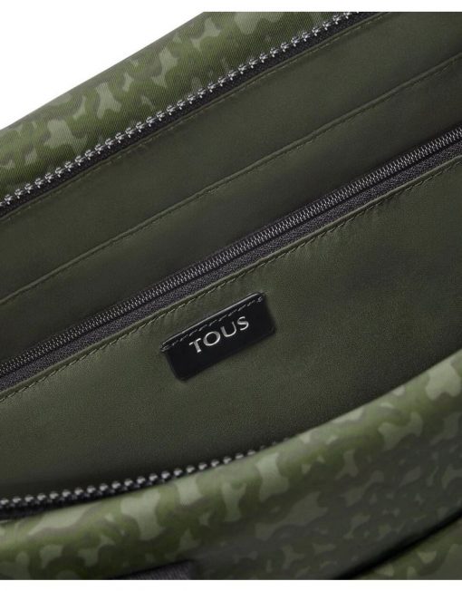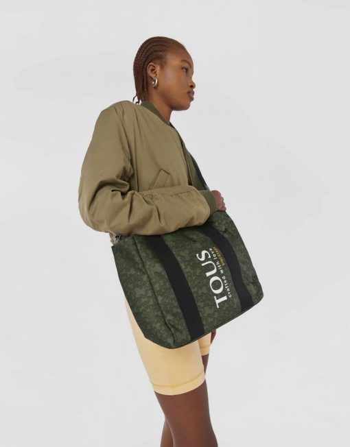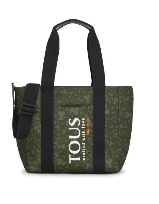 Bolso capazo pequeño TOUS Kaos Mini Evolution en color caqui de nylon reciclado combinado con detalles de piel sintética. Capazo con cierre de cremallera y bolsillo exterior abierto. En el interior hay un bolsillo con cremallera y un bolsillo abierto. Asas fijas de hombro y asa bandolera ajustable y extraíble con ganchos. Medidas (alto x ancho x fondo): 28 x 41 x 13 cm.