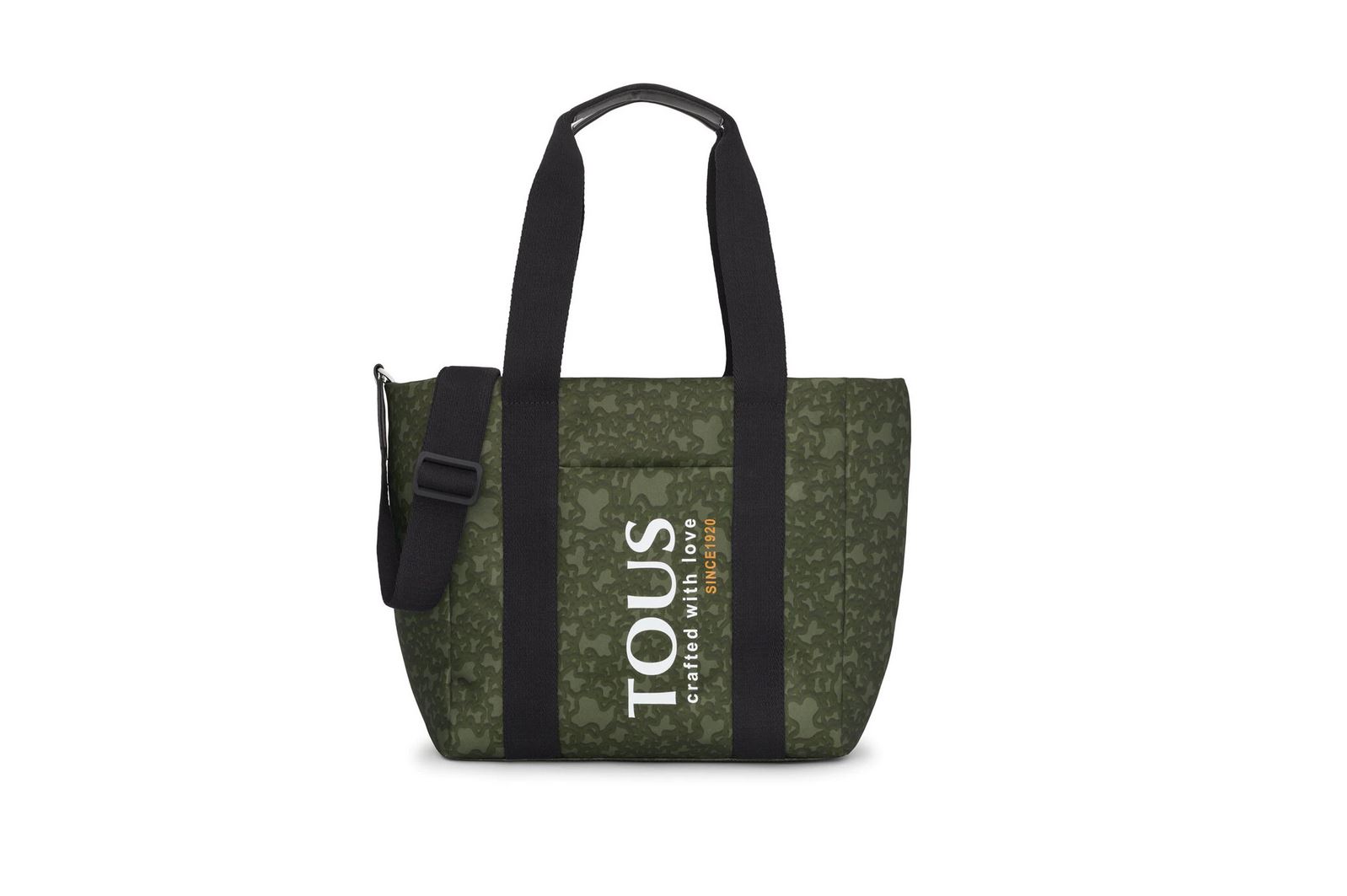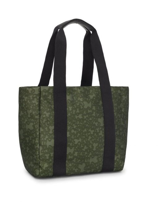 Bolso capazo pequeño TOUS Kaos Mini Evolution en color caqui de nylon reciclado combinado con detalles de piel sintética. Capazo con cierre de cremallera y bolsillo exterior abierto. En el interior hay un bolsillo con cremallera y un bolsillo abierto. Asas fijas de hombro y asa bandolera ajustable y extraíble con ganchos. Medidas (alto x ancho x fondo): 28 x 41 x 13 cm.
