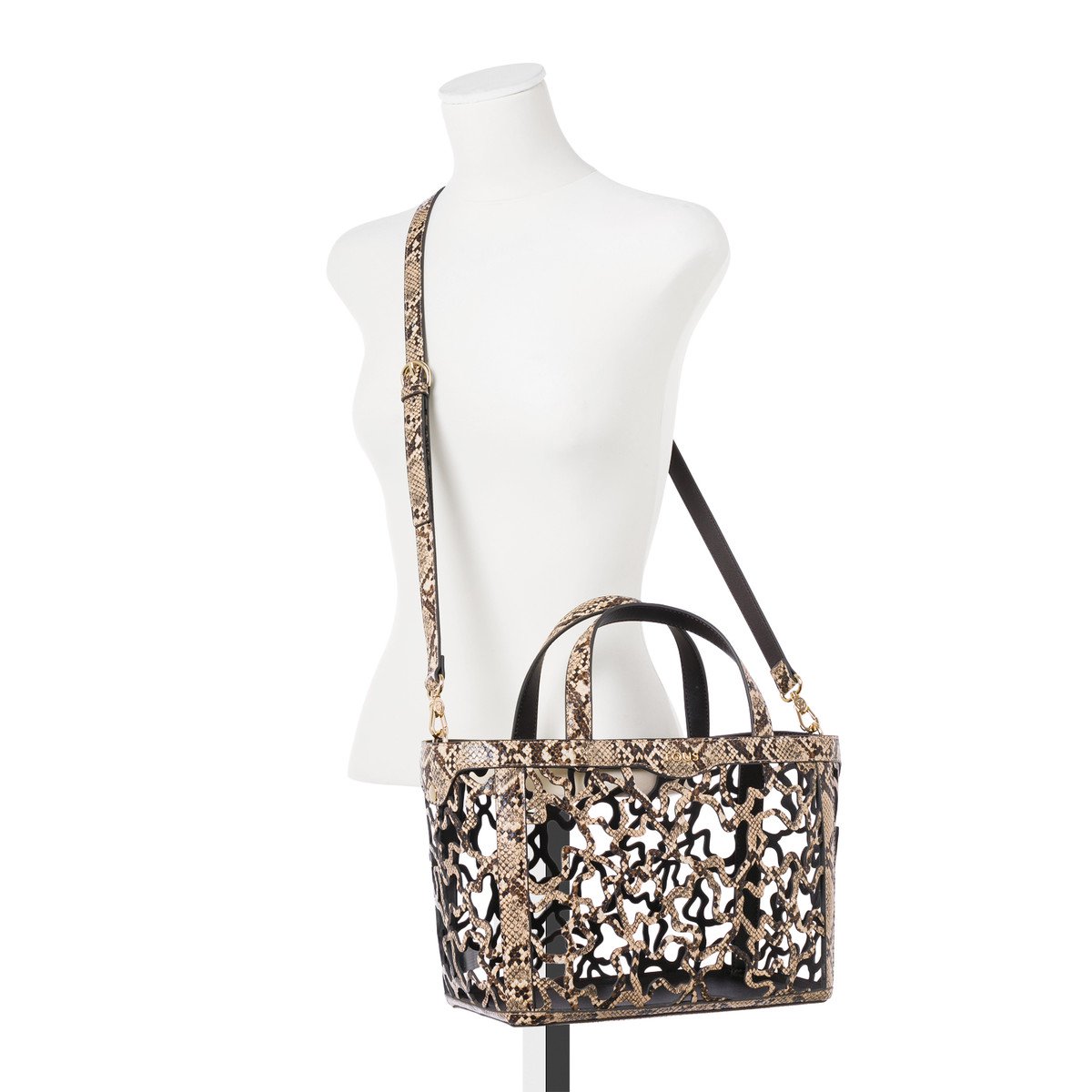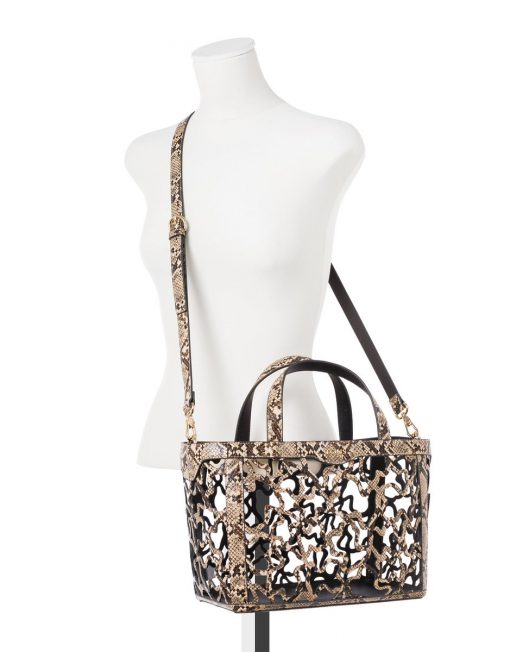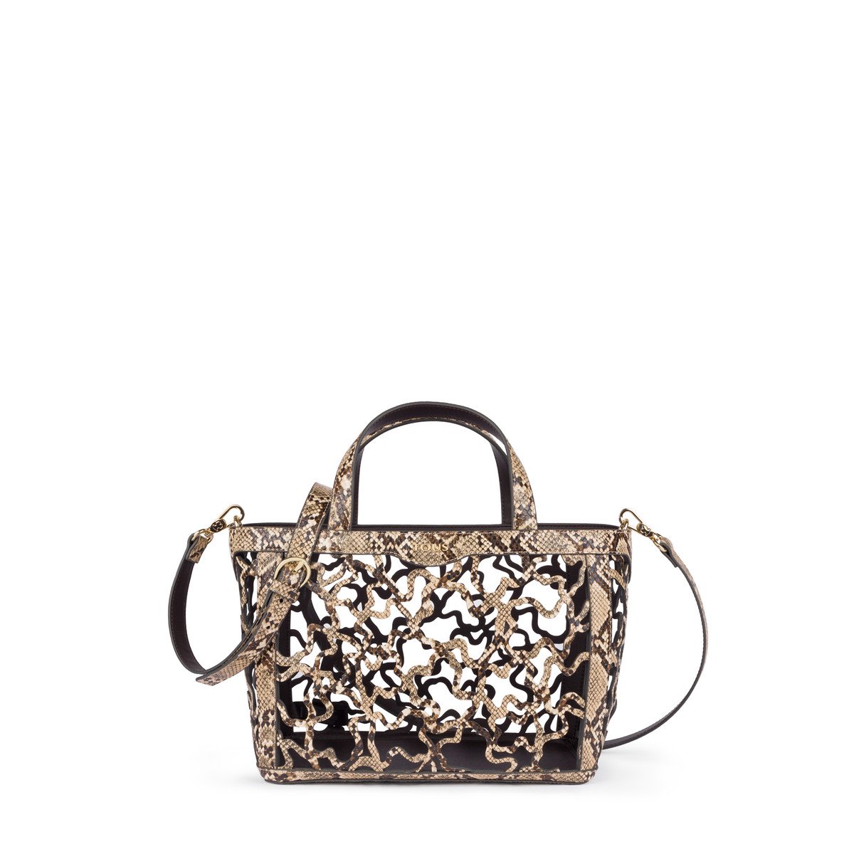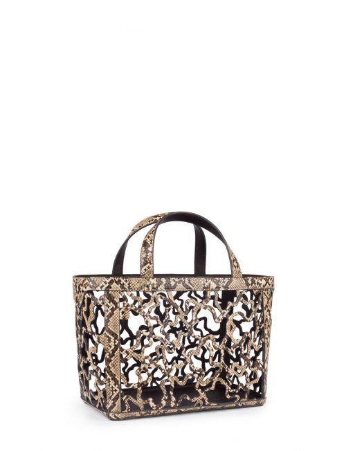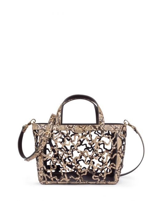 Bolso capazo pequeño TOUS colección Kaos Shock de vinilo efecto piel con grabado serpiente wild-natural y troquelado Kaos. Apliques personalizados en tono dorado pálido. Asas de mano y asa de bandolera ajustable y extraíble. Botones a presión en los laterales interiores para incorporar una bolsa pequeña Kaos Shock. Medidas: 21x28x14 cm.
