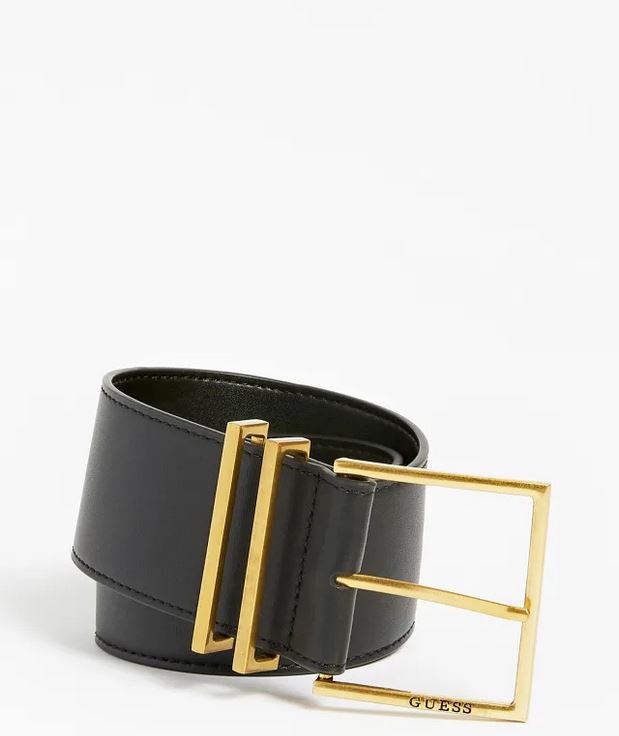 Cinturón de piel sintética. Piezas metálicas de color dorado. Cierre con hebilla y hebijón.