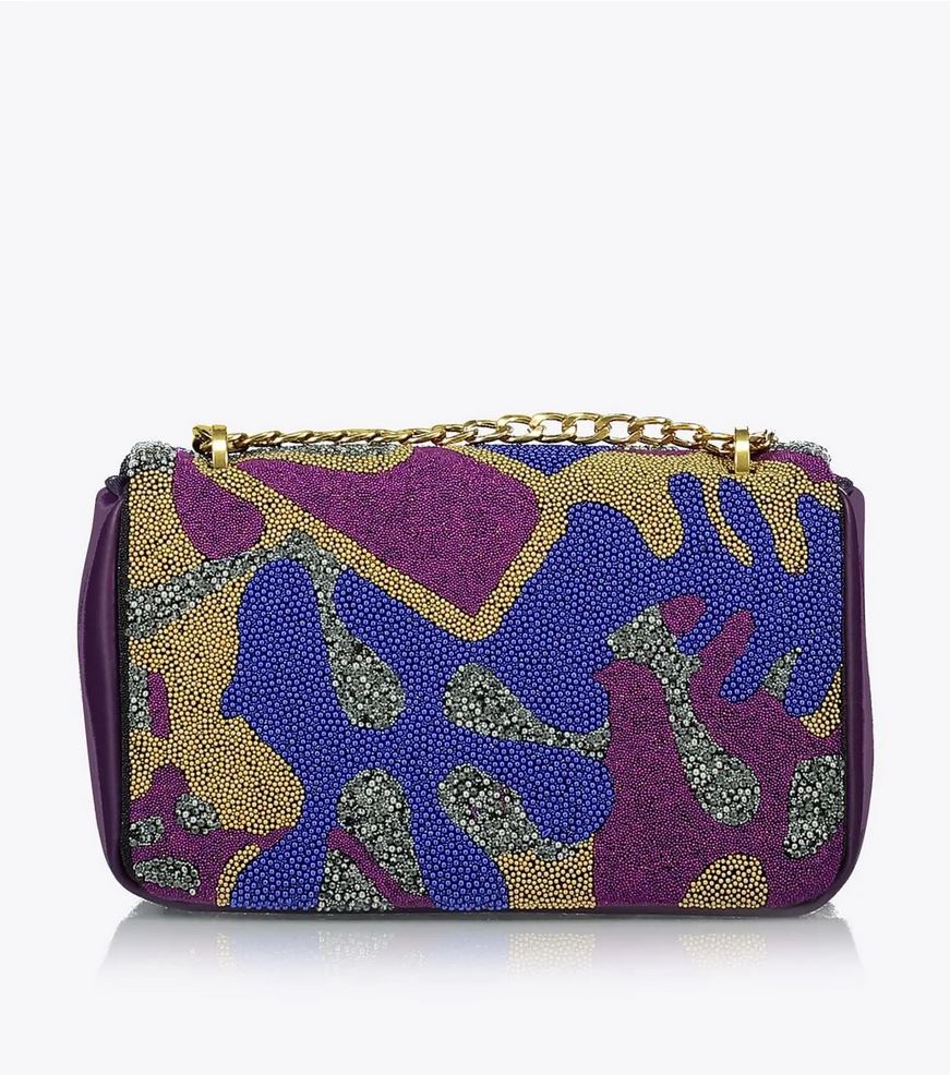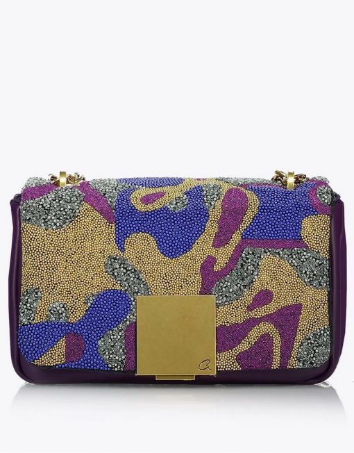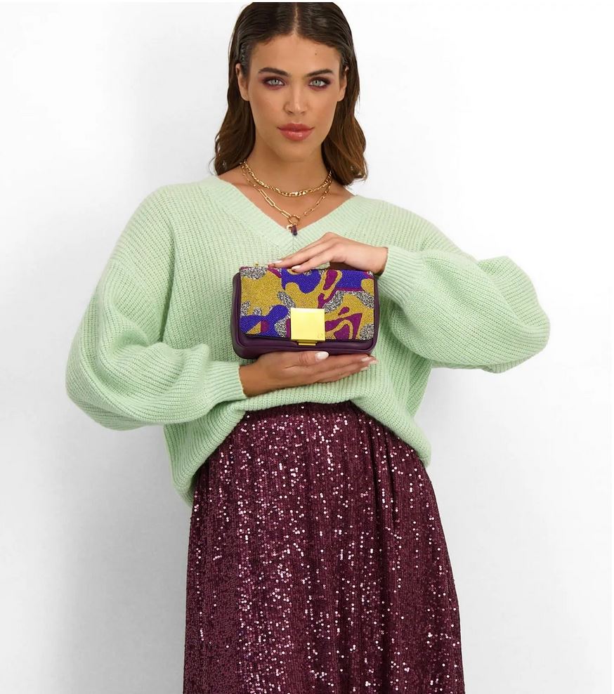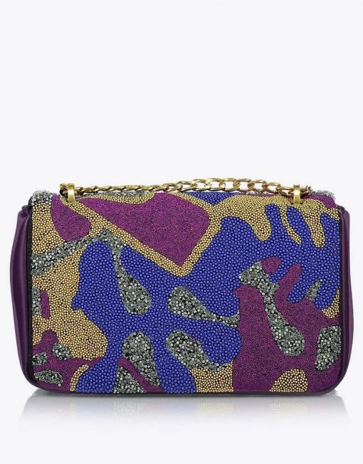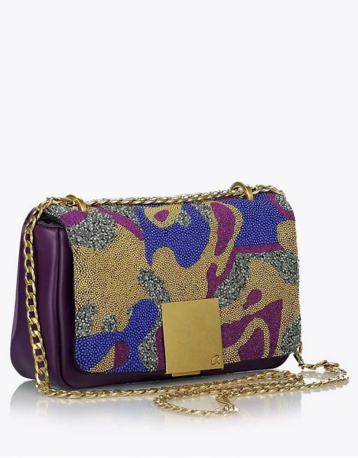Bolso de noche hecho de cuero de alta calidad. Decorado con cuentas de colores. En su interior tiene un compartimento y está forrado con forro. Está en poder de una cadena metálica. Se cierra con un broche en la tapa. Ideal para ocasiones nocturnas especiales.