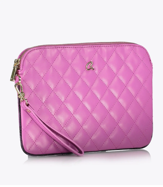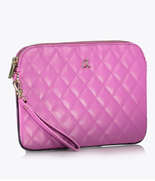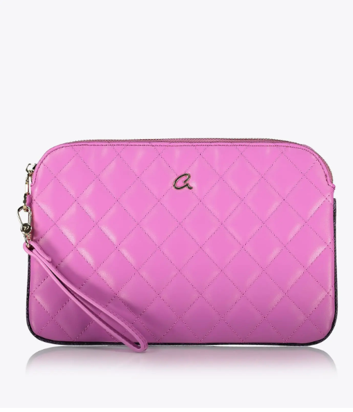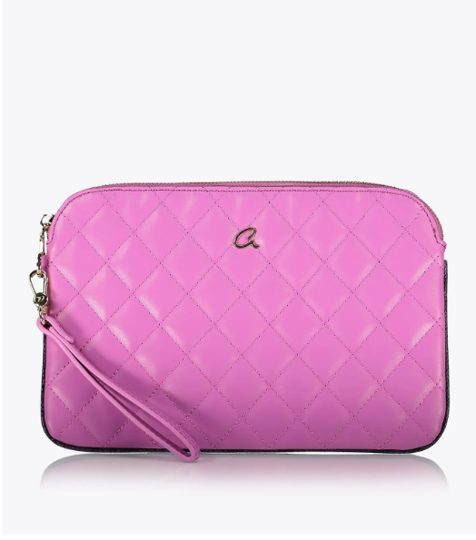 Bolso de mano acolchado para mujer confeccionado en piel sintética de alta calidad. Cuenta con un compartimento principal y una correa de asa desmontable. Se cierra con cremallera. Logotipo metálico con una "a" en la parte delantera.