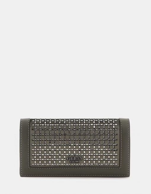 Exterior de piel sintética. Cierre con solapa. Piezas metálicas color plateado.