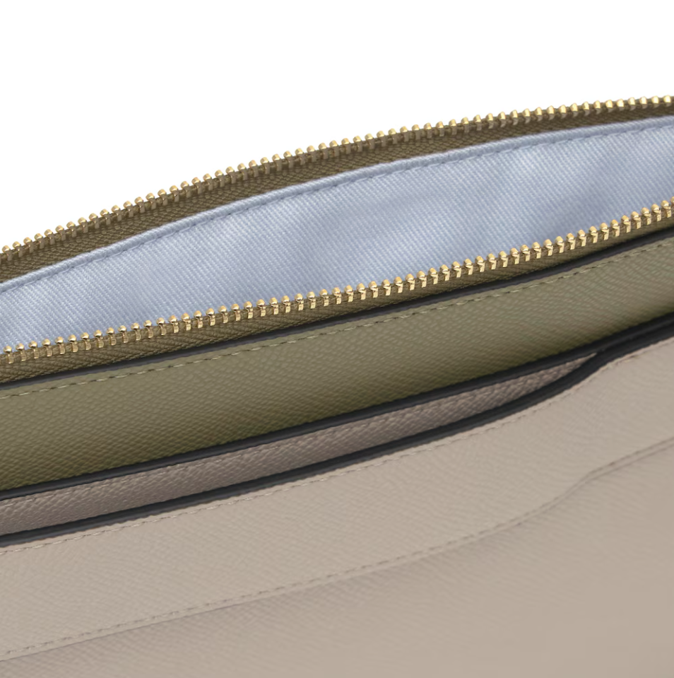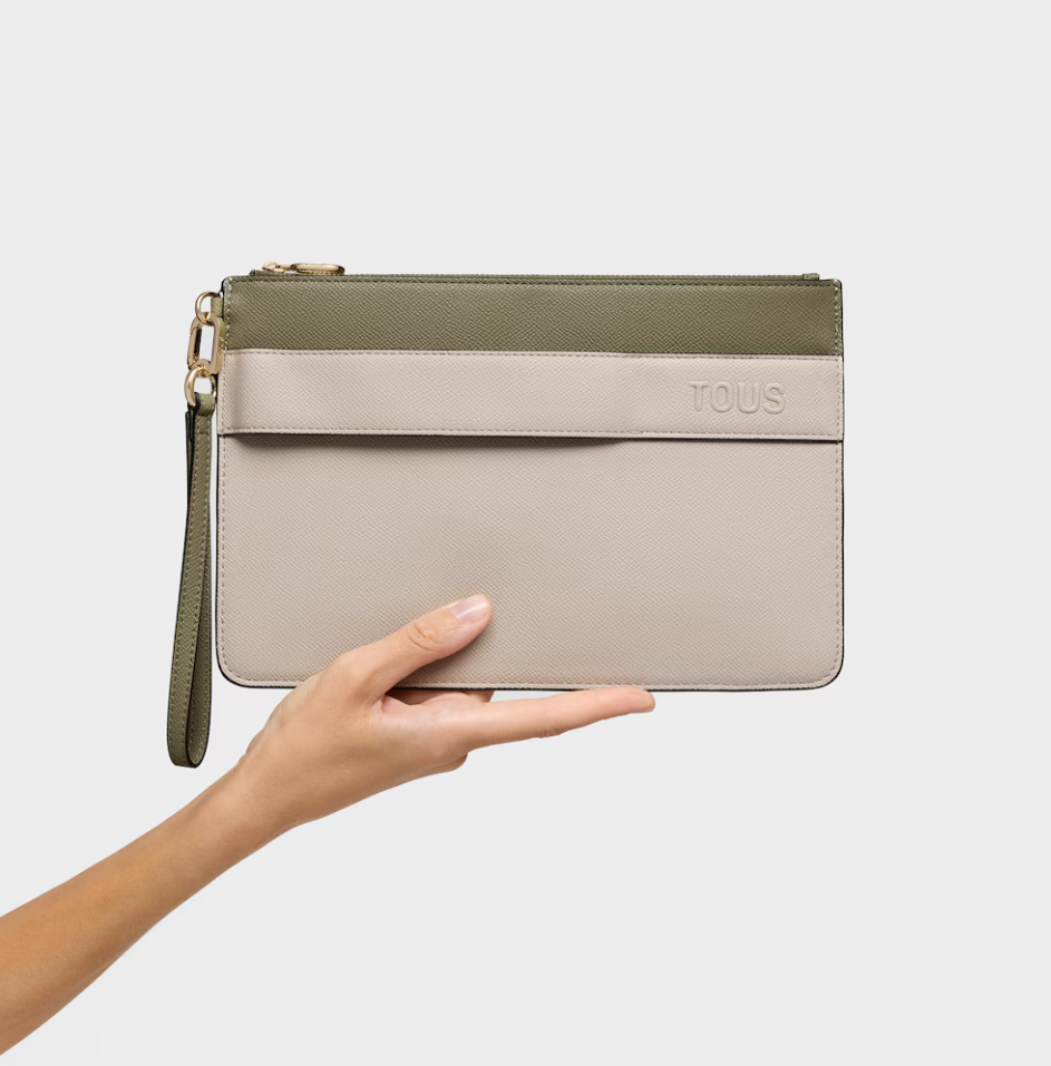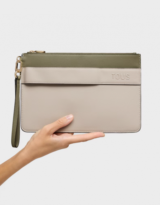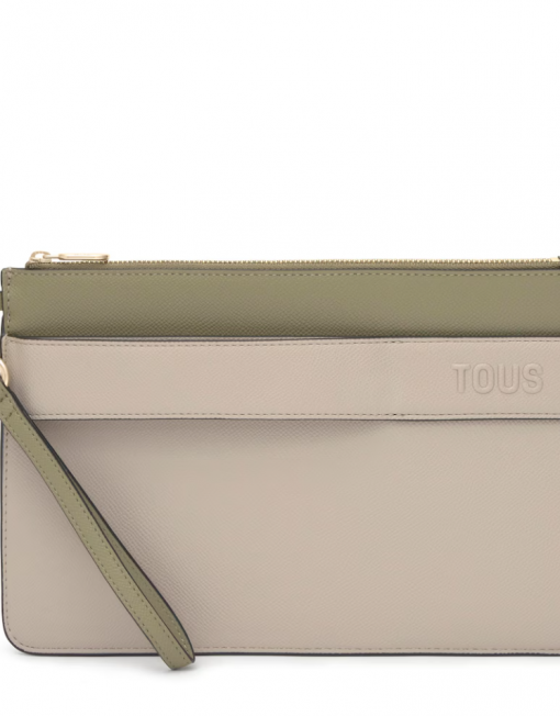 Clutch TOUS Audree Saffiano de poliuretano en color topo y verde oliva. Cierre de cremallera. Dos compartimentos. Asa de mano desmontable. Medidas (alto x ancho x fondo): 17,5 x 26 x 3 cm.