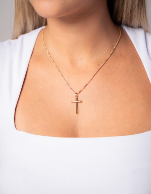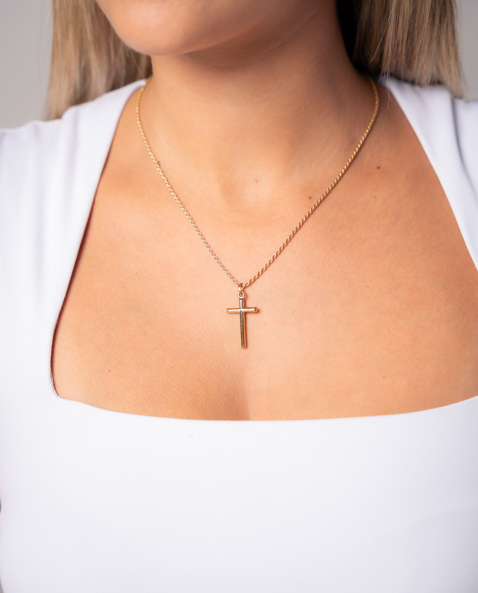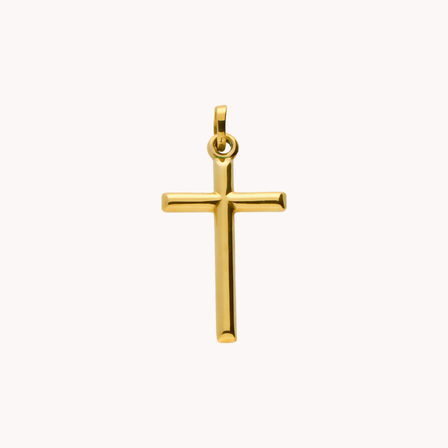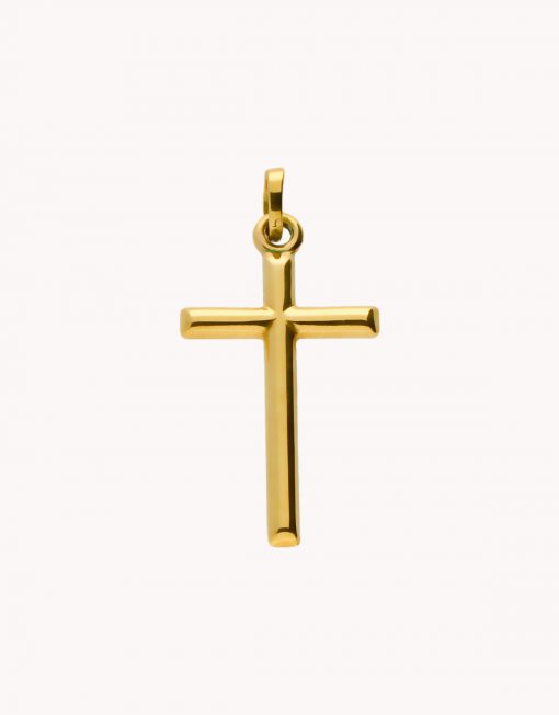 Colgante de plata de ley 925 bañada en oro 18K con forma de cruz de 15 mm x 25 mm (ancho por alto).