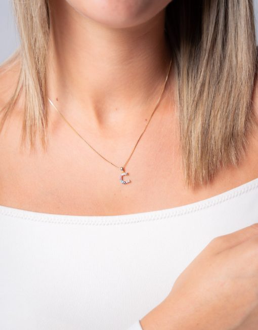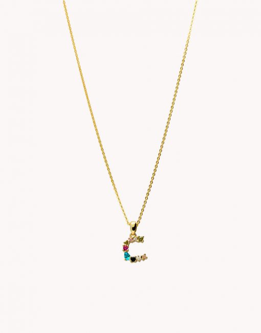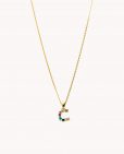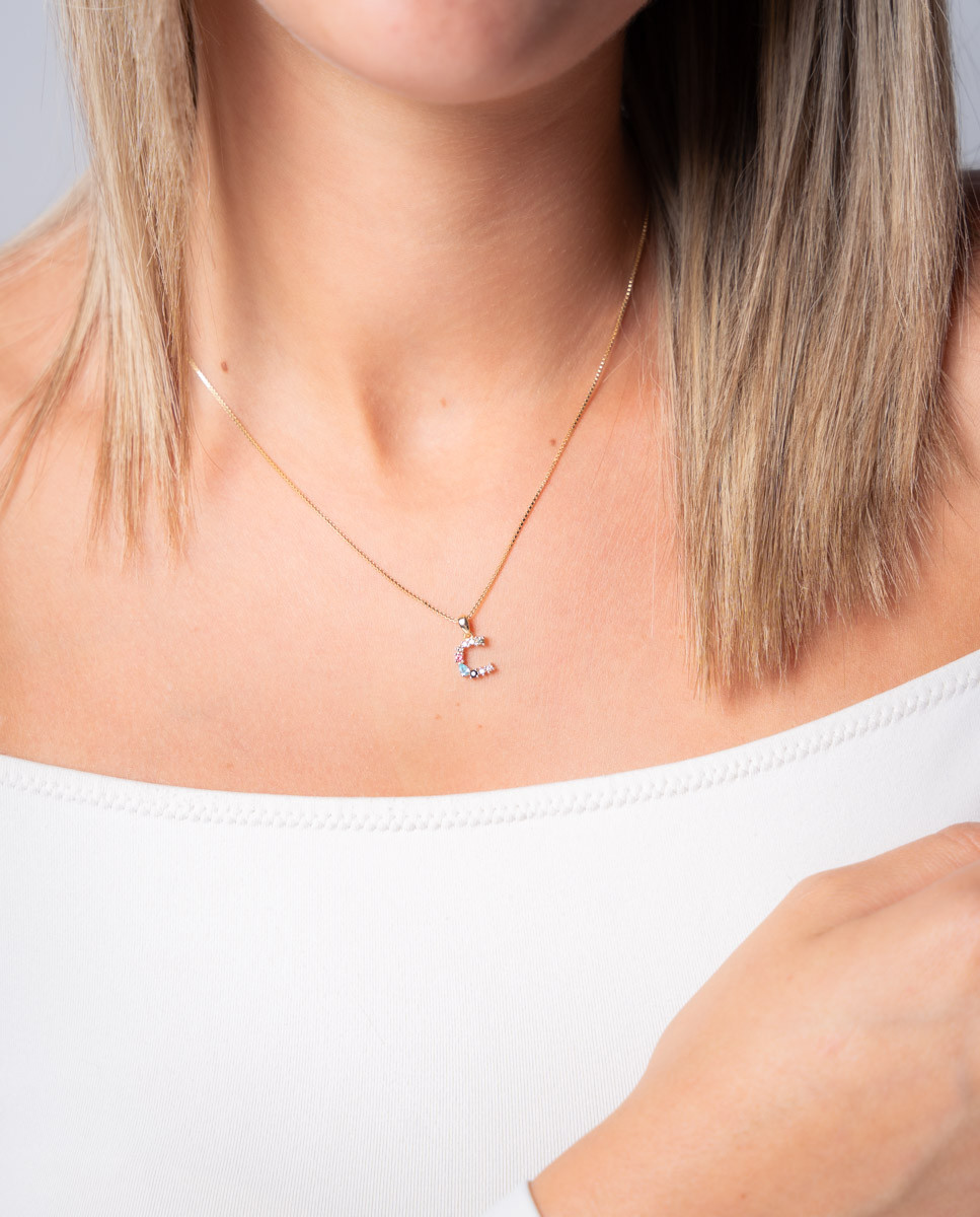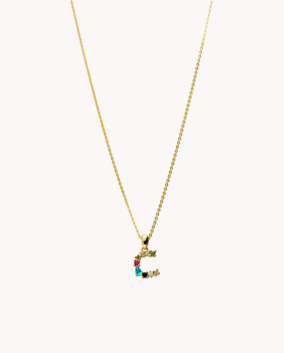 Colgante de plata de ley 925 bañada en oro con inicial C de aproximadamente 5 mm x 10 mm (ancho por alto) y circonitas multicolor. Cadena de 40 cms de largo más 5 cms de alargador y cierre tipo reasa.