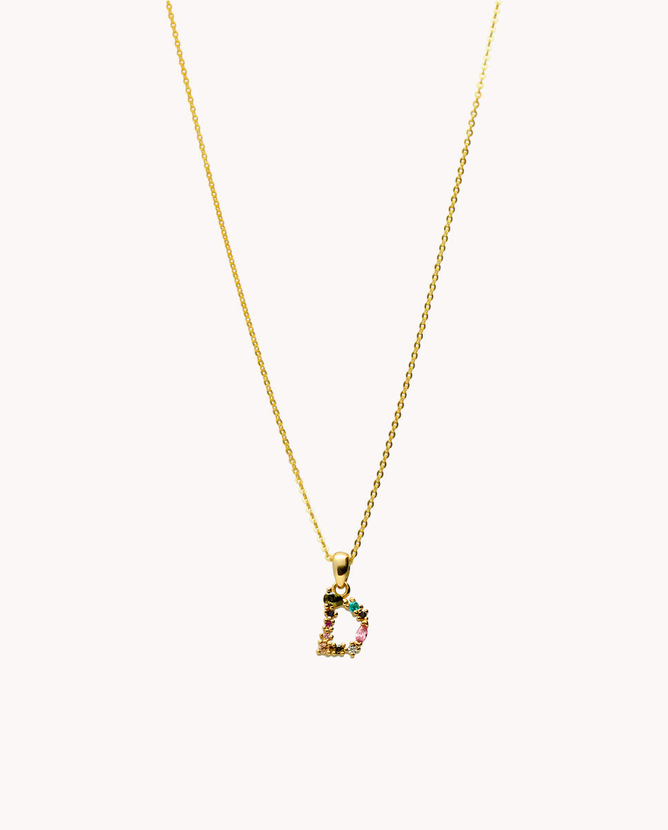 Colgante de plata de ley 925 bañada en oro con inicial D de aproximadamente 5 mm x 10 mm (ancho por alto) y circonitas multicolor. Cadena de 40 cms de largo más 5 cms de alargador y cierre tipo reasa.