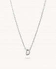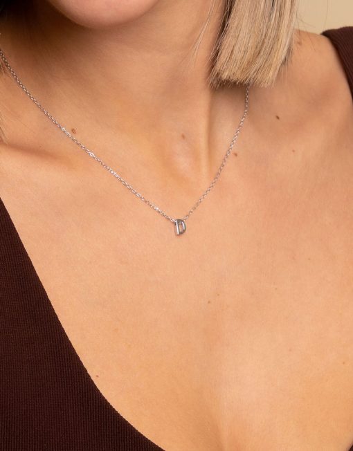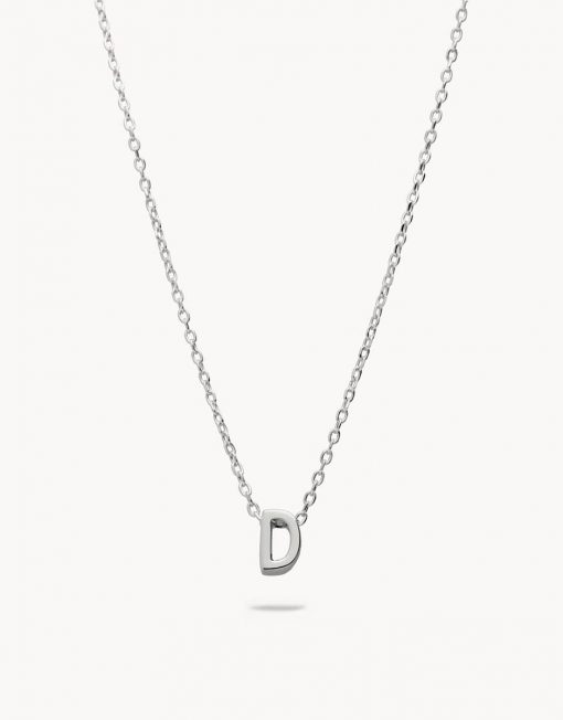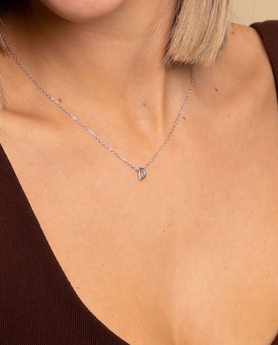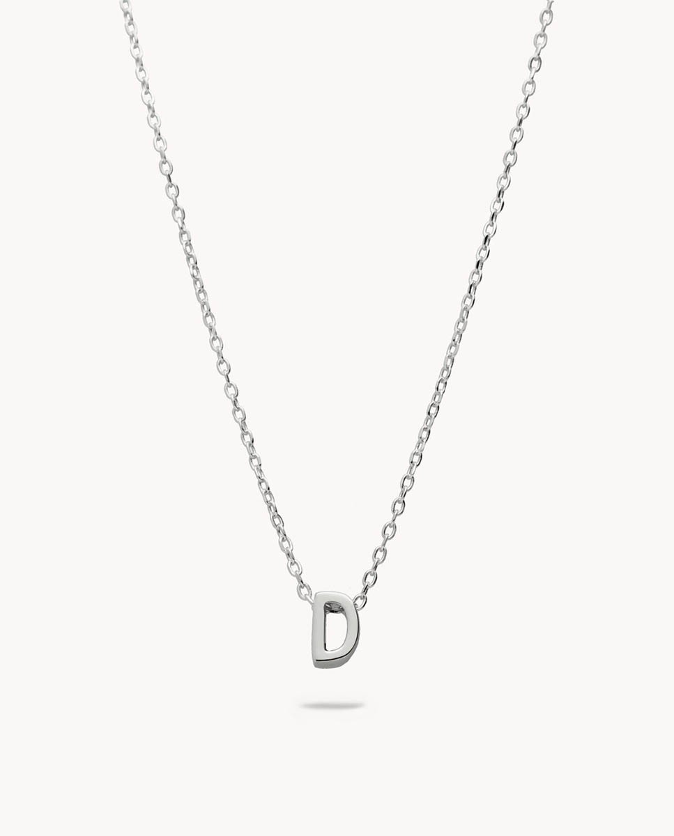 Collar de plata de ley 925 bañada en rodio con inicial D de 7 mm de alto y 3 mm de grosor, cadena de 40 cms más 5 cms de alargador y cierre de mosquetón.