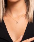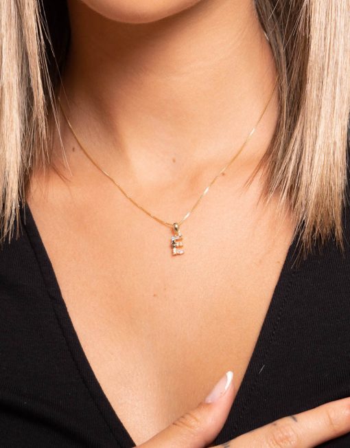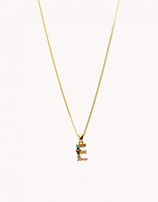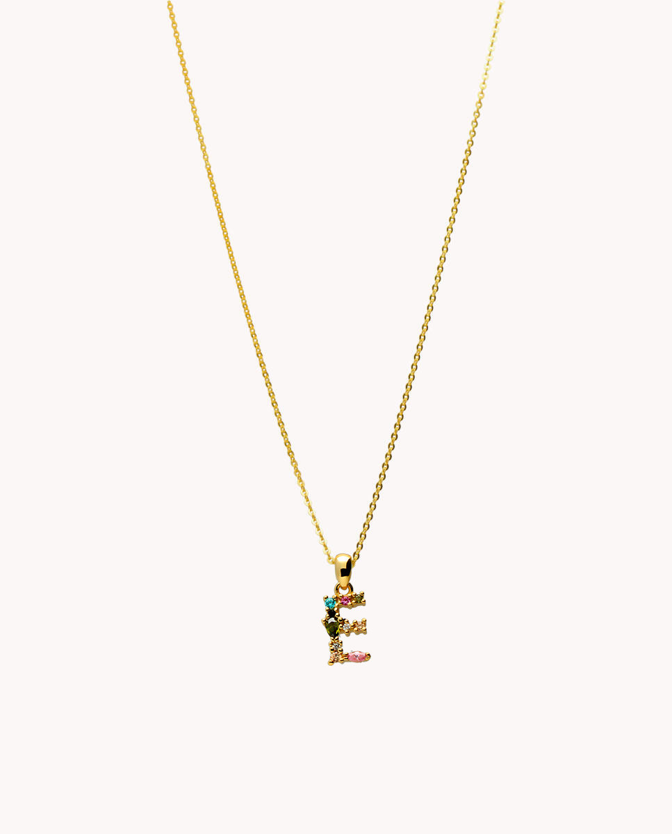 Colgante de plata de ley 925 bañada en oro con inicial E de aproximadamente 5 mm x 10 mm (ancho por alto) y circonitas multicolor. Cadena de 40 cms de largo más 5 cms de alargador y cierre tipo reasa.
