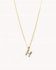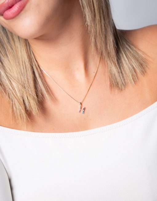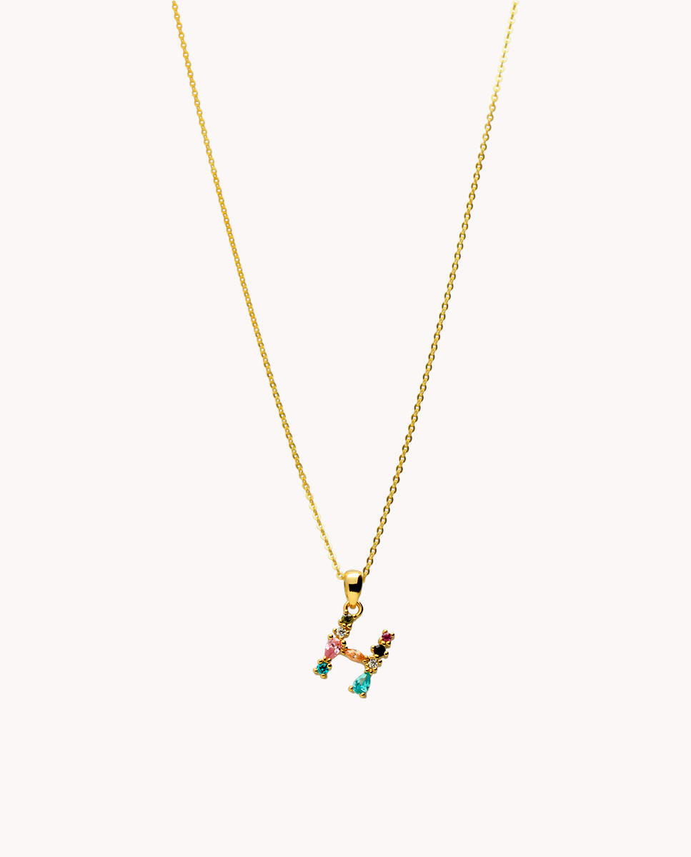 Colgante de plata de ley 925 bañada en oro con inicial H de aproximadamente 5 mm x 10 mm (ancho por alto) y circonitas multicolor. Cadena de 40 cms de largo más 5 cms de alargador y cierre tipo reasa.