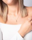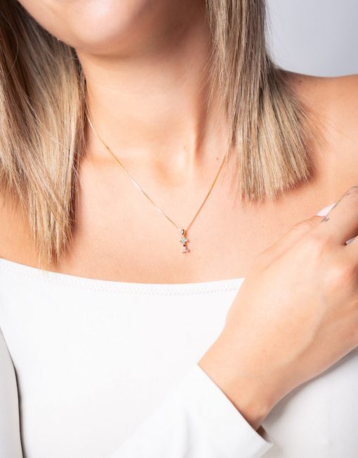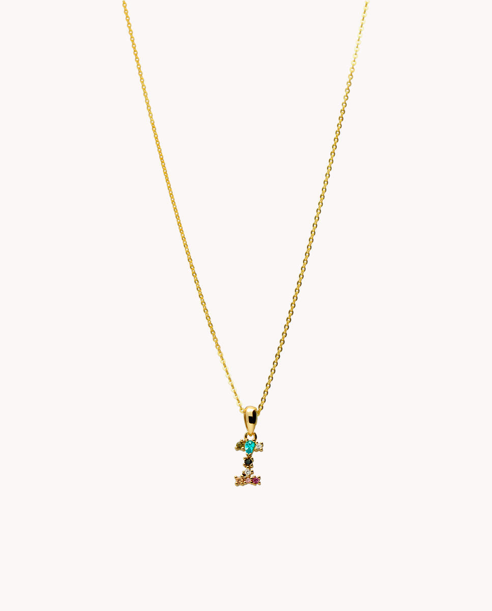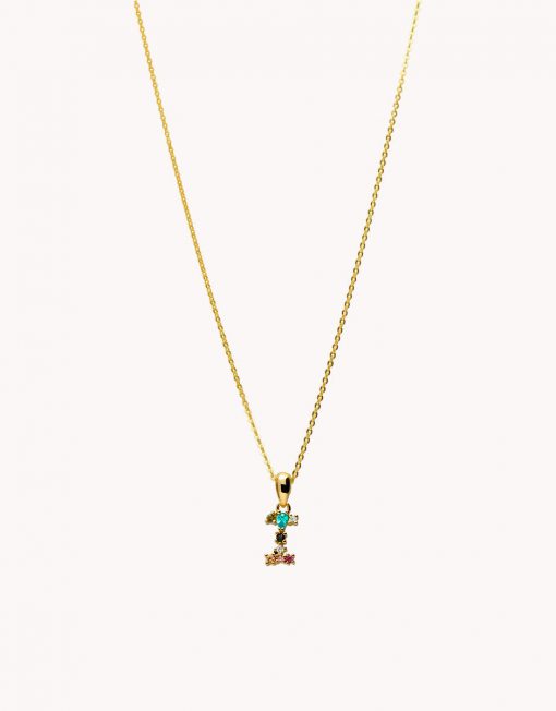 Colgante de plata de ley 925 bañada en oro con inicial I de aproximadamente 5 mm x 10 mm (ancho por alto) y circonitas multicolor. Cadena de 40 cms de largo más 5 cms de alargador y cierre tipo reasa.