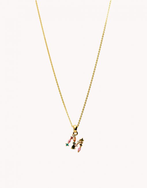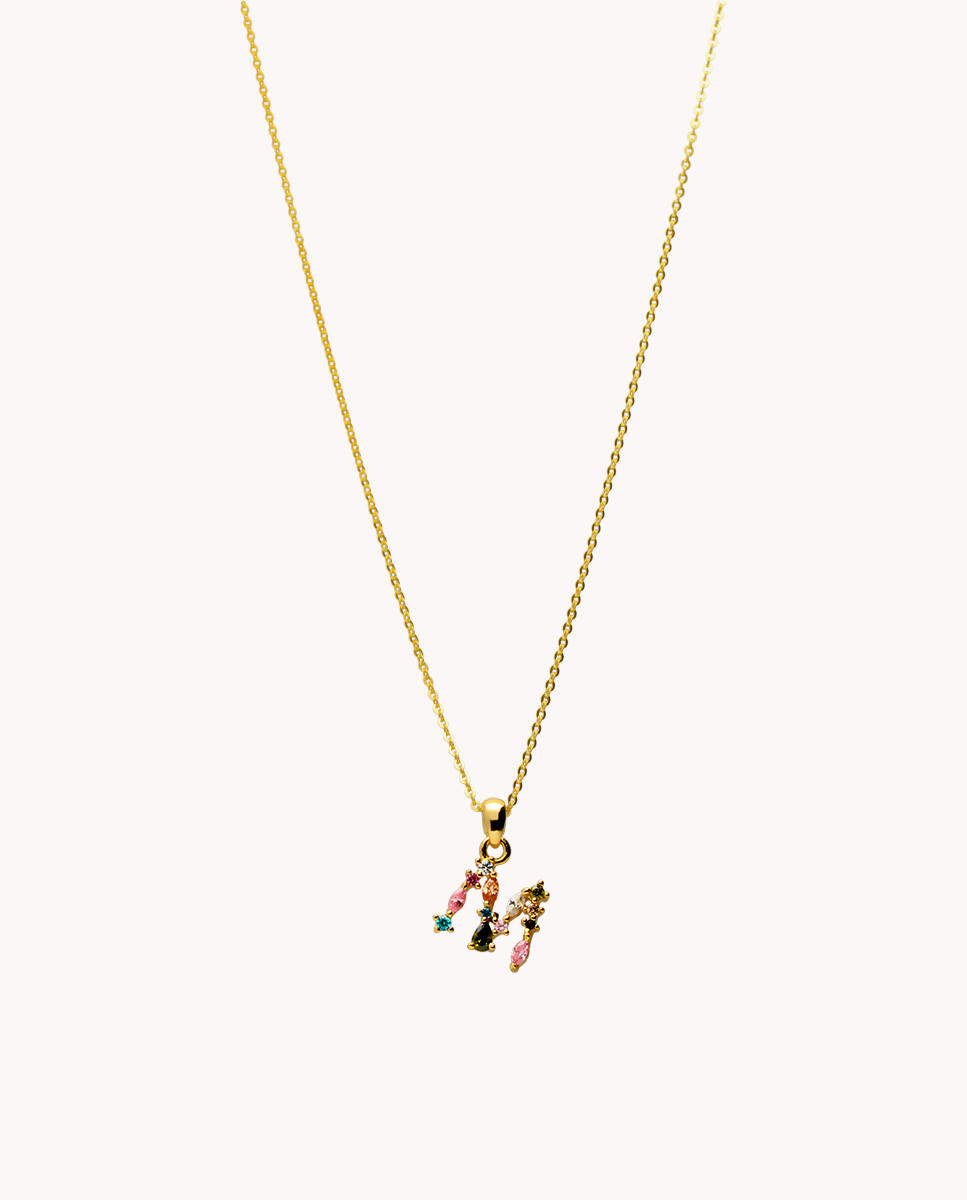 Colgante de plata de ley 925 bañada en oro con inicial M de aproximadamente 5 mm x 10 mm (ancho por alto) y circonitas multicolor. Cadena de 40 cms de largo más 5 cms de alargador y cierre tipo reasa.