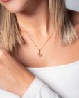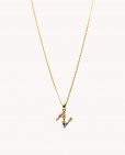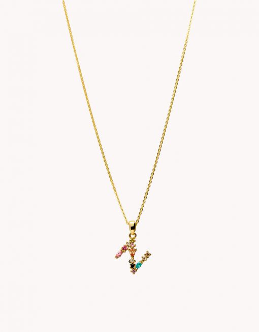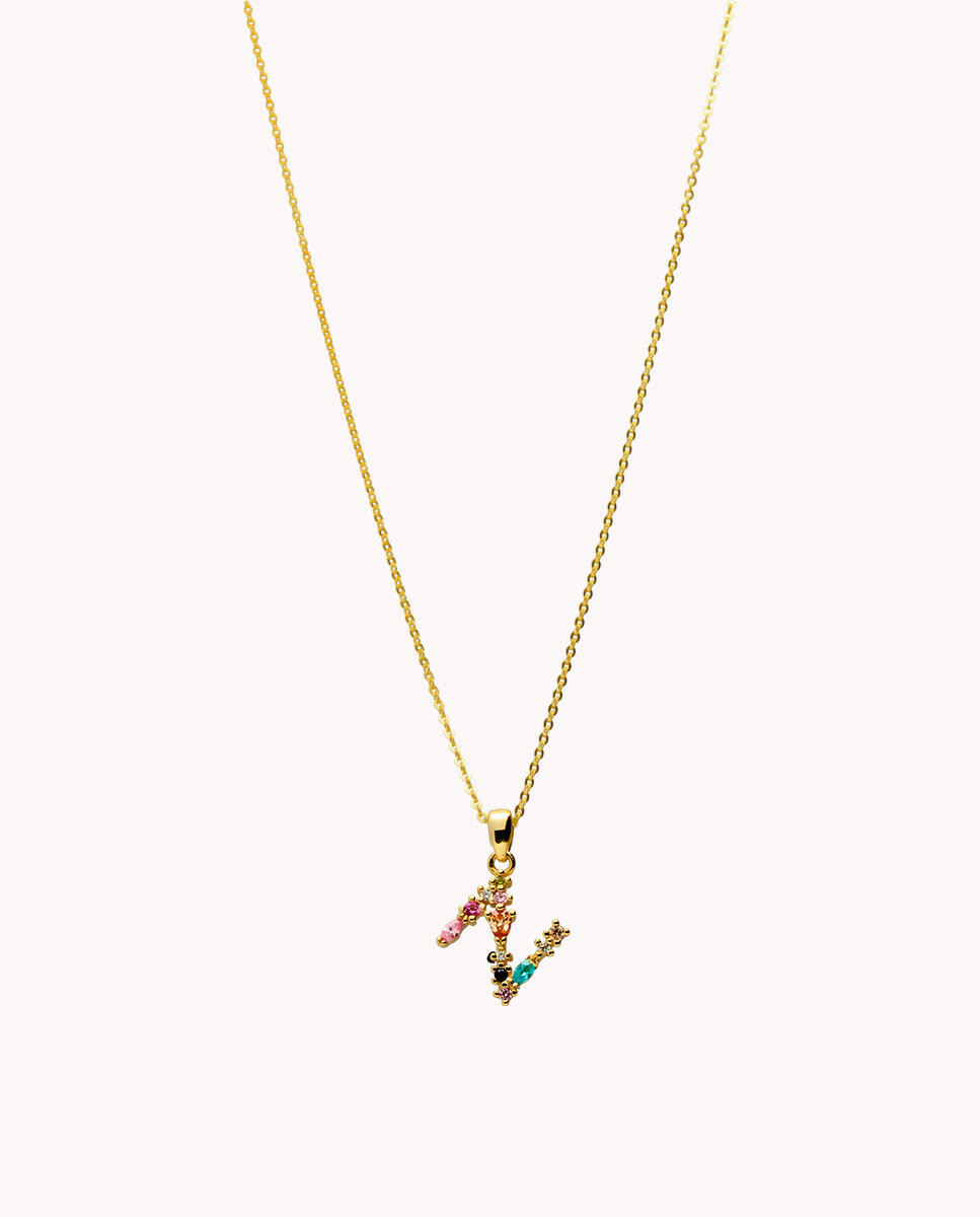 Colgante de plata de ley 925 bañada en oro con inicial N de aproximadamente 5 mm x 10 mm (ancho por alto) y circonitas multicolor. Cadena de 40 cms de largo más 5 cms de alargador y cierre tipo reasa.