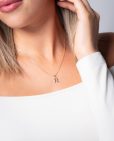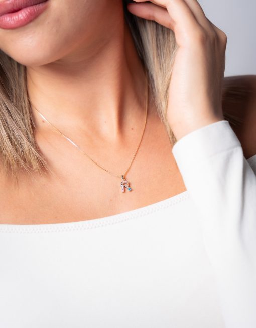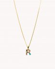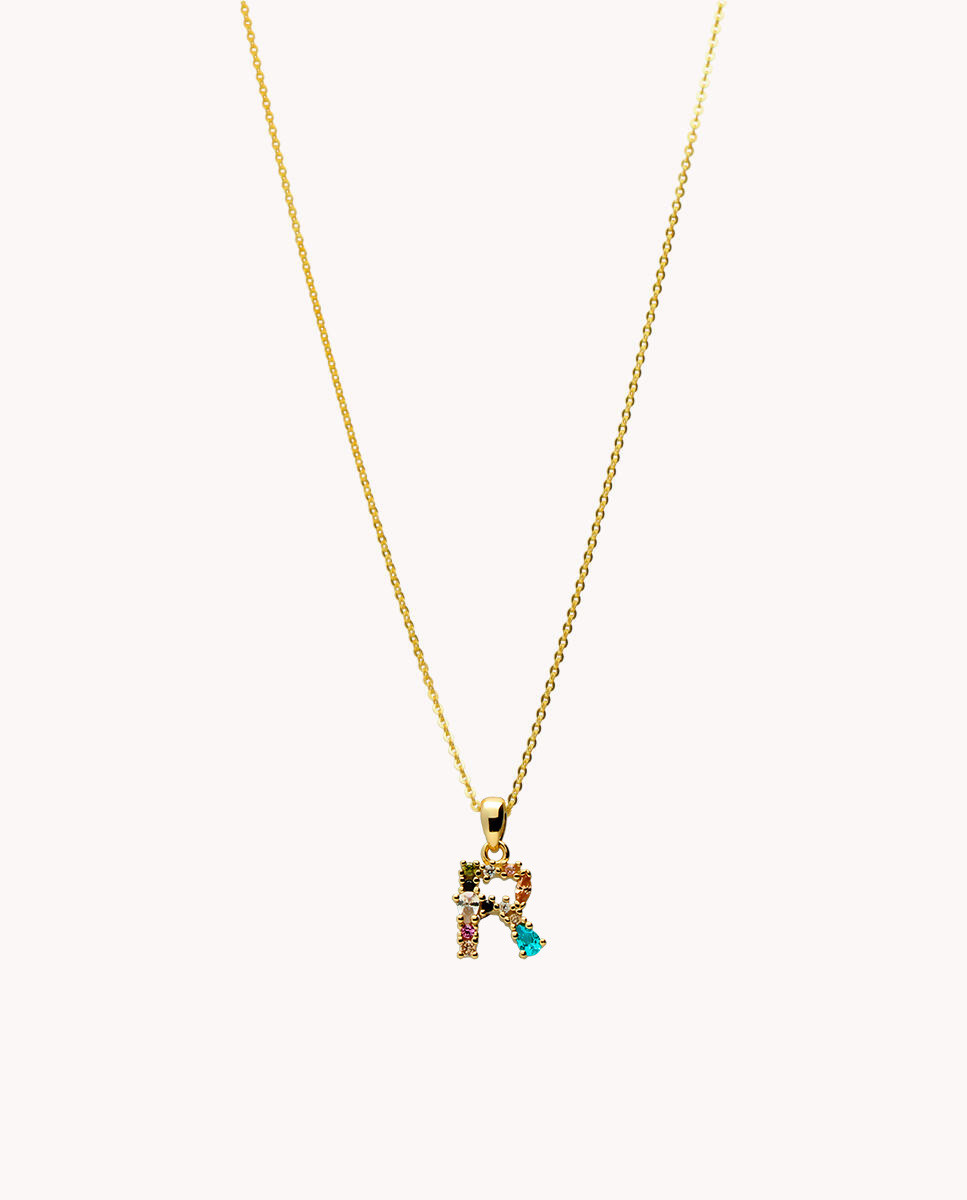 Colgante de plata de ley 925 bañada en oro con inicial R de aproximadamente 5 mm x 10 mm (ancho por alto) y circonitas multicolor. Cadena de 40 cms de largo más 5 cms de alargador y cierre tipo reasa.