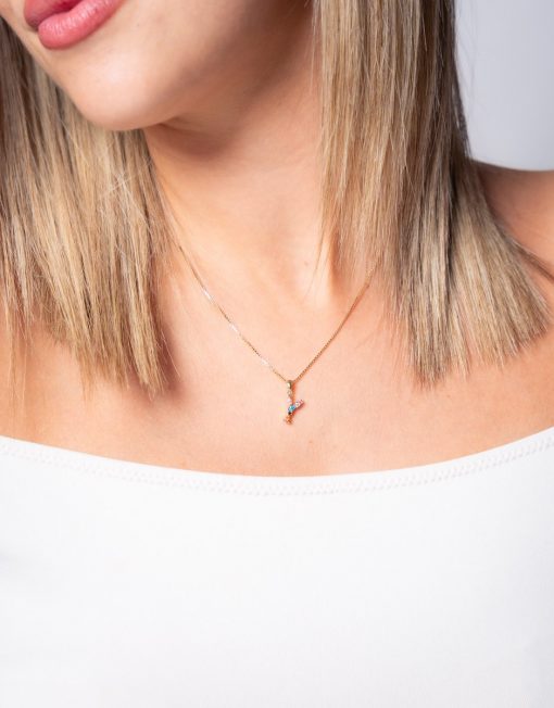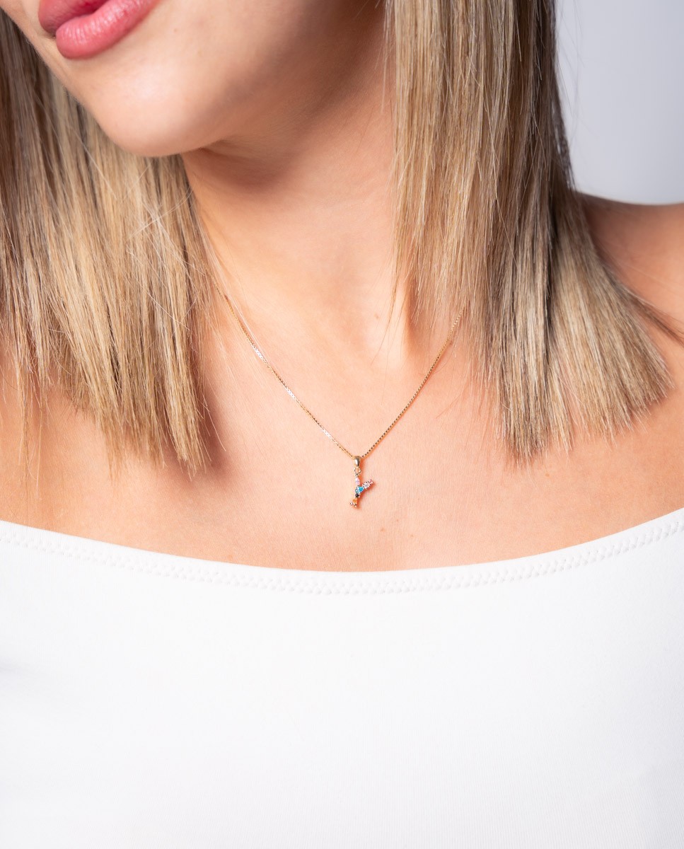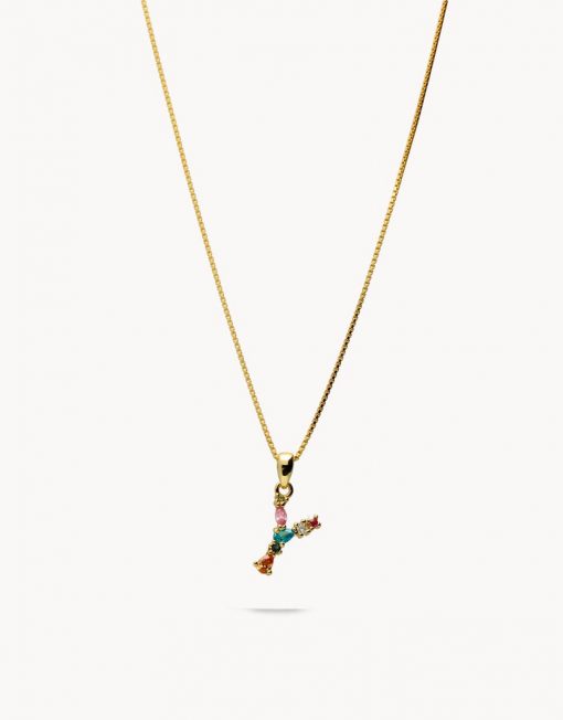 Colgante de plata de ley 925 bañada en oro con inicial Y de aproximadamente 5 mm x 10 mm (ancho por alto) y circonitas multicolor. Cadena de 40 cms de largo más 5 cms de alargador y cierre tipo reasa.