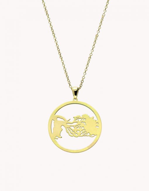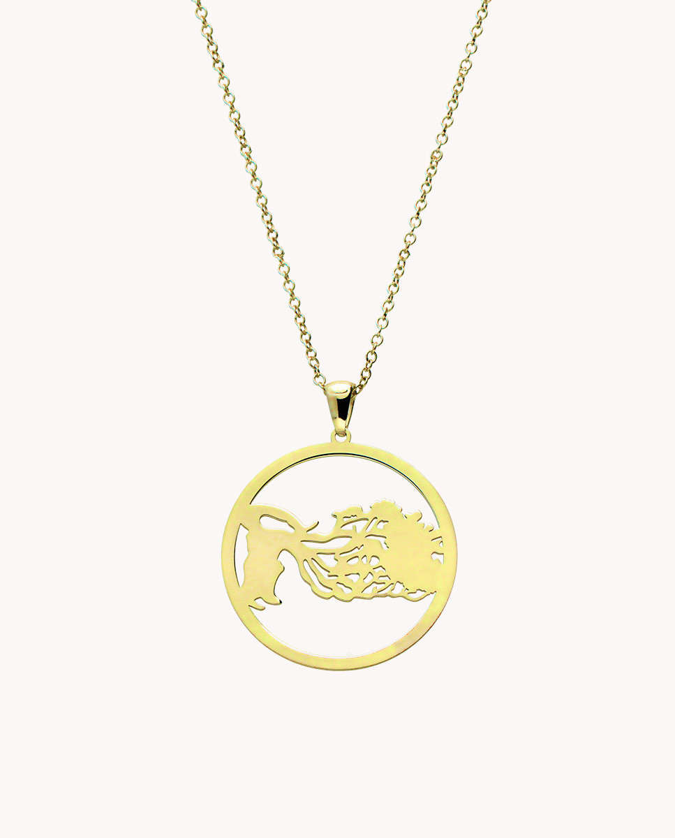 Detalles: Colgante de plata de ley 925 bañada en oro 18K con círculo y en su interior la sabina de la isla de El Hierro. Cadena de 40 cms de largo más 5 cms de alargador con cierre de mosquetón.