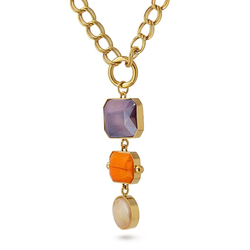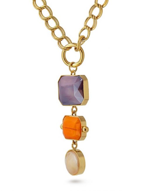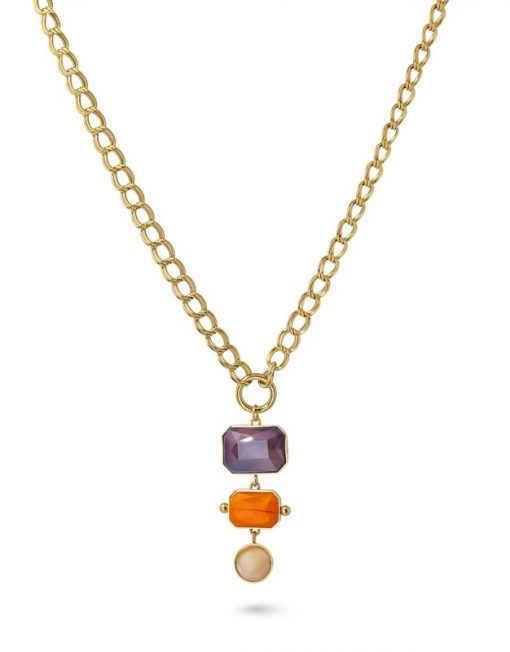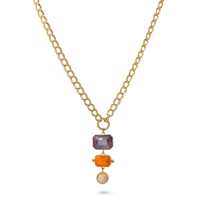 Collar de eslabones con colgante formado por tres piezas geométricas de cristal coloreado.