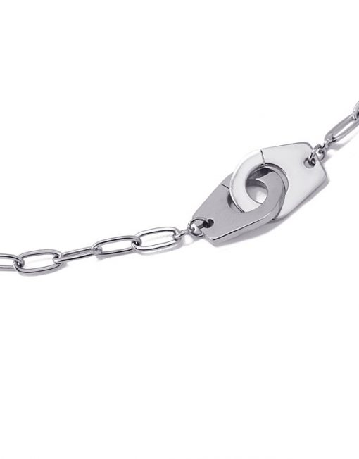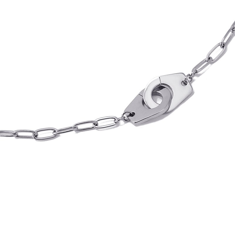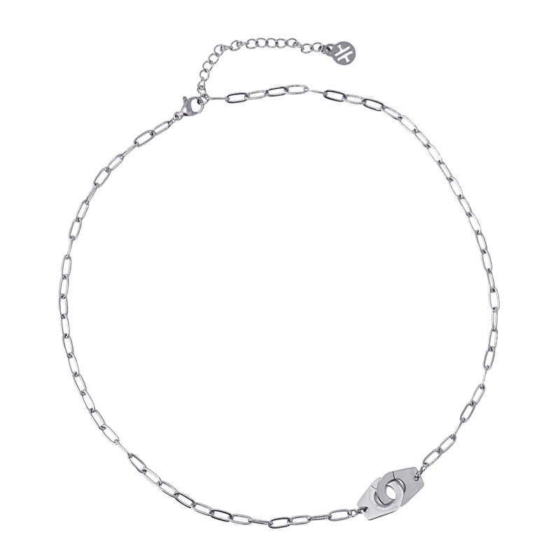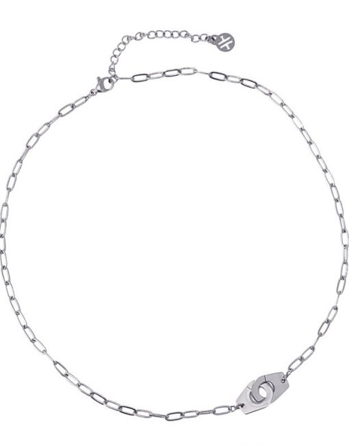 Collar de eslabones con detalle grilletes. Un original accesorio que podrás llevar a diario combinado con otras piezas de la colección ‘Chains’. Es de acero quirúrgico con acabado pulido. Resistente al roce y al agua, es ideal porque no produce alergias. La cadena mide 38 cm de largo, por lo que queda bastante cerca del cuello, pero gracias a su cadena de extensión podrás ajustar su altura. ¿Te lo regalas?