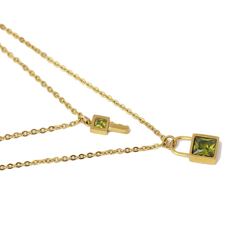 Collar doble capa de cadena fina y detealles llave y candado con circonita coloreada en verde o negro. Es de acero quirúrgico hipoalergénico y lo puedes llevar a diario porque combina bien con todo tipo de looks. Un esencial que te acompañará siempre. Disponible pulsera, pendientes y anillo a juego. Las cadenas miden 38 y 42 cm y cuentan con extensión de 5 cm y cierre tipo langosta.