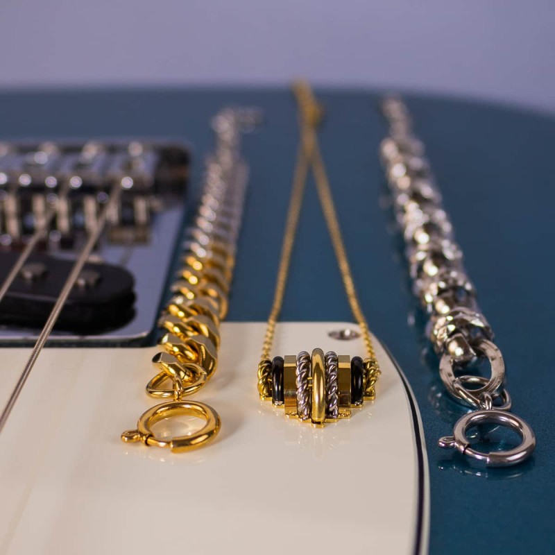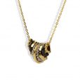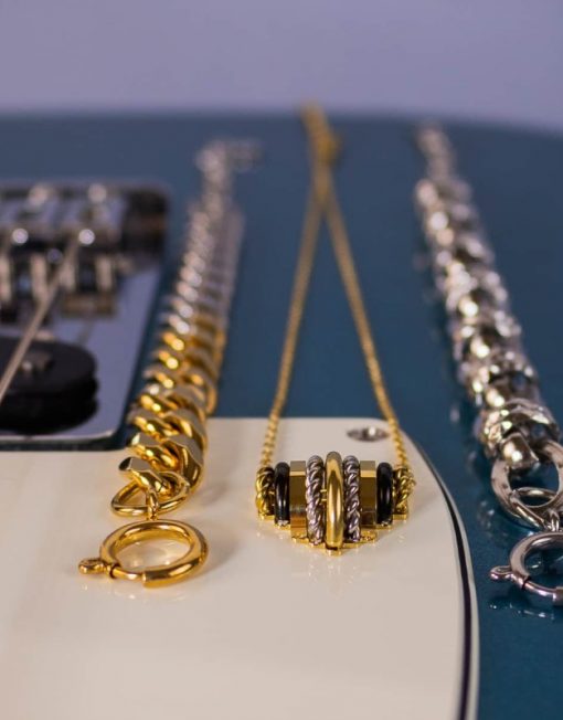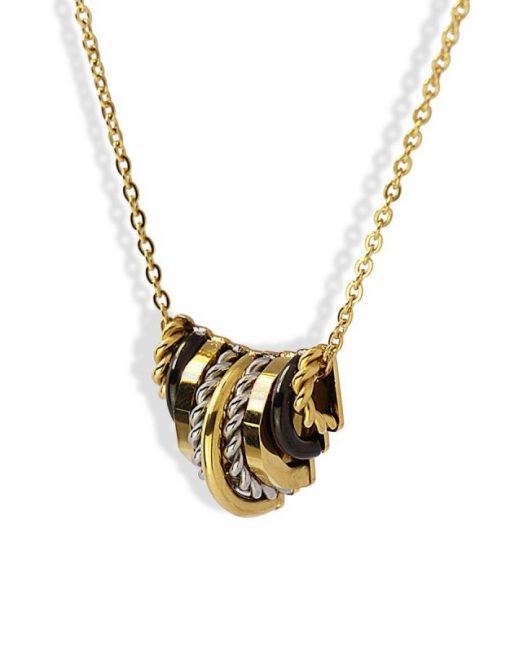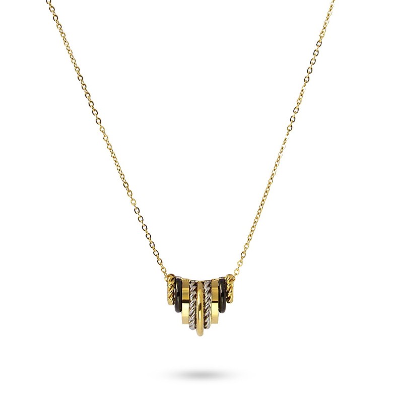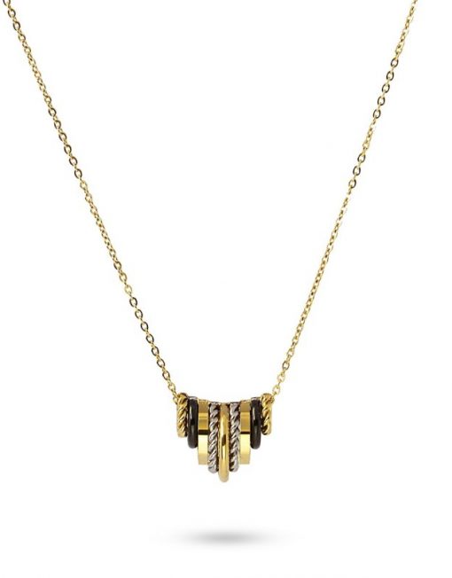 Collar de cadena fina con colgante formado por 9 líneas de aros con diferentes diseños y texturas. Se combina el color negro, dorado y plateado en un collar de acero quirúrgico súper ponible y versátil. La cadena mide 35 cm y cuenta con extensión extra de 5 cm y cierre tipo langosta. ¿Te lo compras?