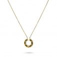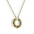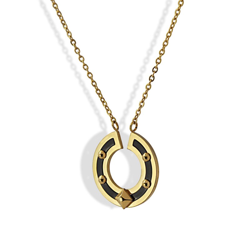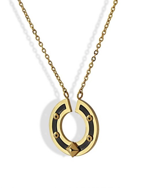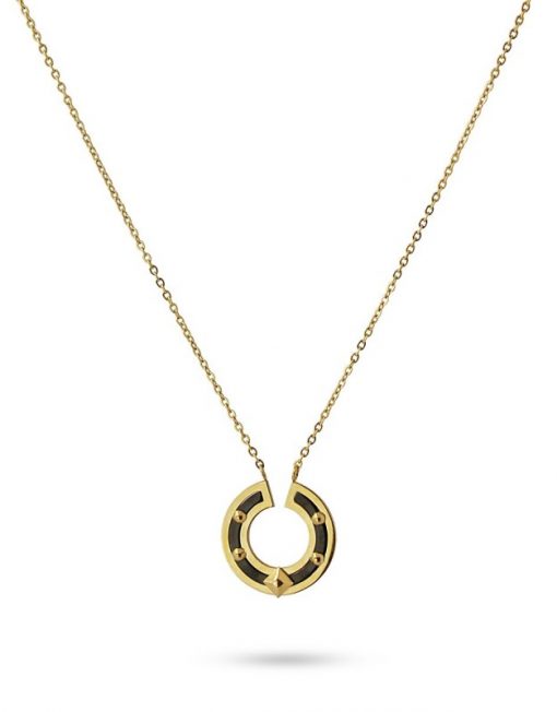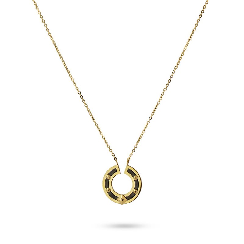 Collar de cadena fina con colgante circular bicolor con detalles tipo remaches. Geometría y mestizaje se aunan en una pieza singular que combina a la perfección con looks en negro y con otras cadenas doradas. Es de acero quirúrgico hipoalergénico. La cadena mide 40 cm y tiene extensión extra de 5 cm. El colgante semicircular mide 20 mm. ¿Te gusta?