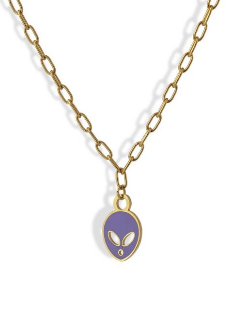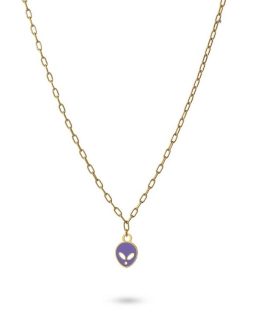 Collar de acero quirúrgico hipoalergénico en color dorado con colgante plano en forma de cabeza de extraterrestre esmaltado en color verde, morado o rosa. Sencillo, discreto y con un toque divertido, es ideal para llevar a diario durante todo el año. Disponible pulsera, anillo y pendientes a juego. La cadena mide 40 cm y tiene una extensión de 5 cm extra y cierre tipo langosta. El colgante mide 12 mm.