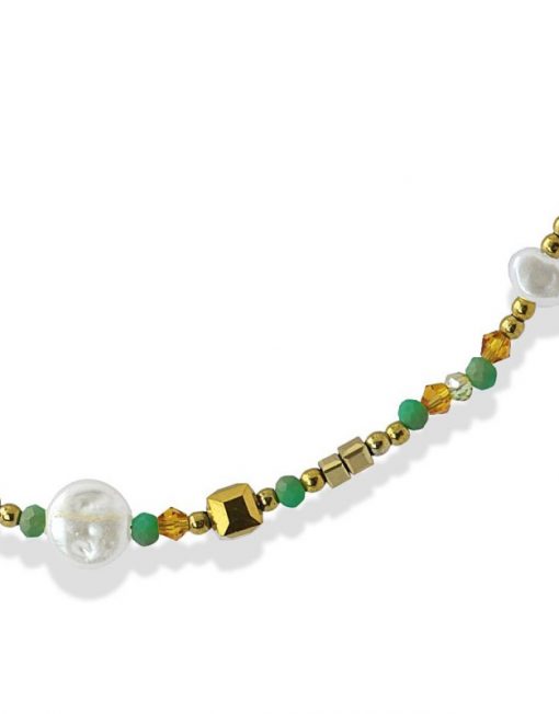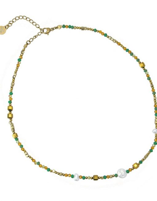 Collar corto con cuentas de cristal, hematita, piedra natural, perlas de agua dulce y acero quirúrgico. Ideal para llevar con su pulsera a juego y aportar un toque de luz y color. Disponible en 6 colores tendencia. La cadena mide 40 cm y lleva una extensión extra y cierre tipo langosta. Hipoalergénico.