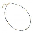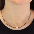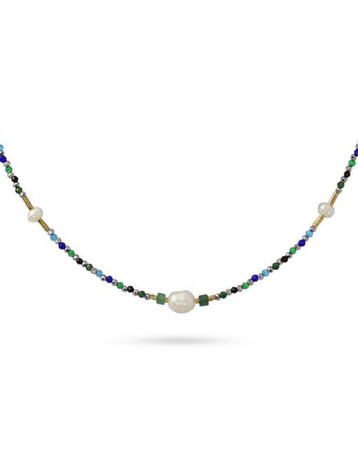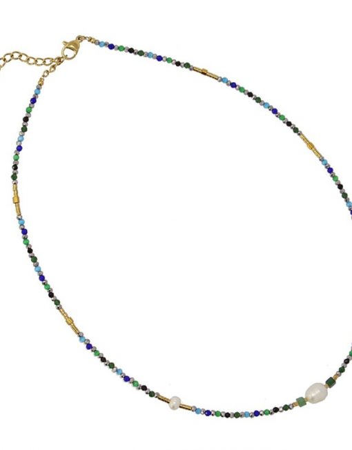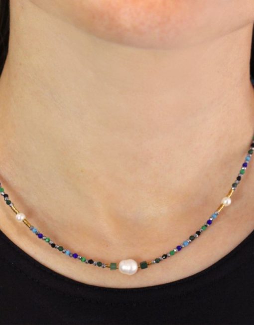 Collar corto con cuentas de cristal, hematita, piedra natural, perlas de agua dulce y acero quirúrgico. Cargado de color y vitalidad, es perfecto para levantar un look plano de forma discreta. Combínalo con su pulsera a juego. Disponible en azul y rosa. La cadena mide 40 cm y lleva una extensión y cierre tipo langosta. Hipoalergénico.