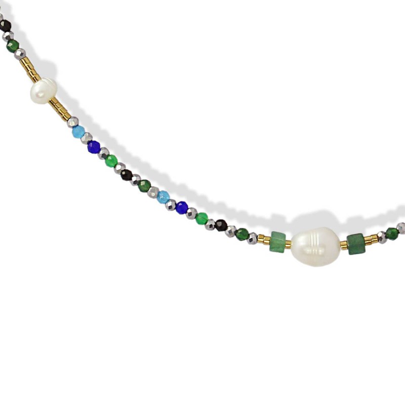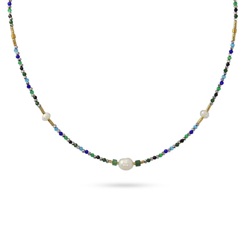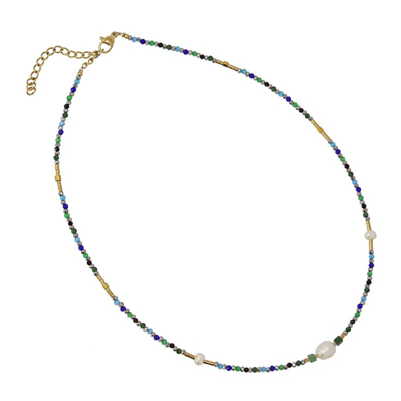 Collar corto con cuentas de cristal, hematita, piedra natural, perlas de agua dulce y acero quirúrgico. Cargado de color y vitalidad, es perfecto para levantar un look plano de forma discreta. Combínalo con su pulsera a juego. Disponible en azul y rosa. La cadena mide 40 cm y lleva una extensión y cierre tipo langosta. Hipoalergénico.