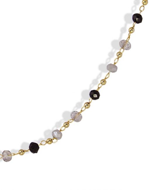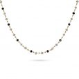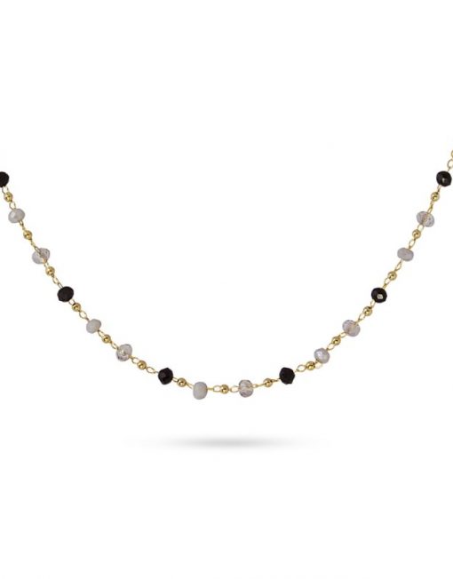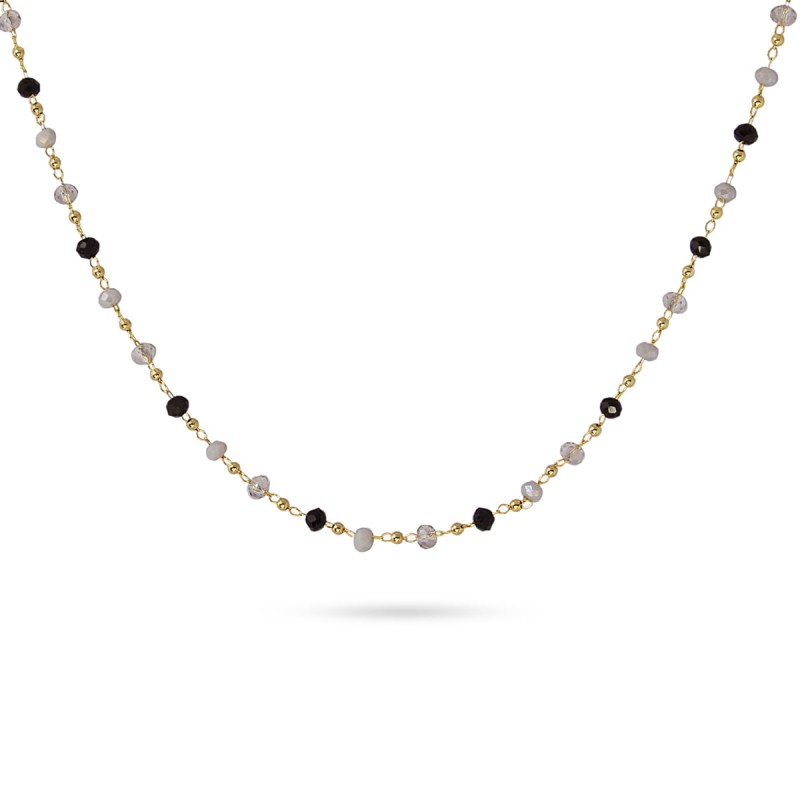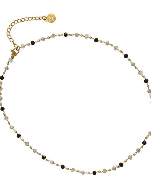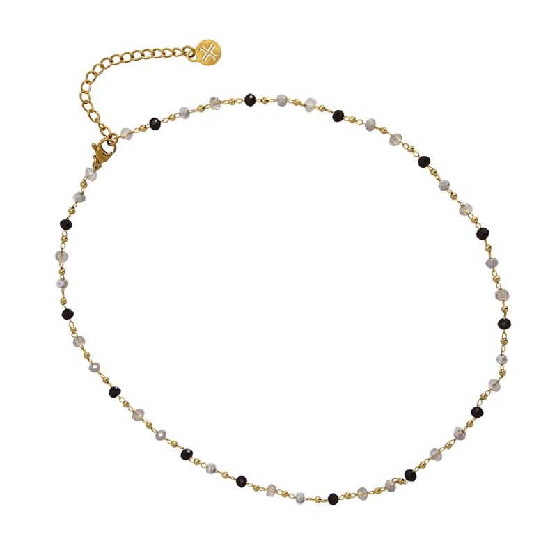 Collar corto de acero quirúrgico con mini abalorios de piedra de cristal coloreada de 3 mm. Llévalo combinado con su pulsera o tobillera a juego o con otros collares dorados a modo de cascada. Disponible en 5 tonalidades de color. Mide 40 cm de largo y lleva una extensión extra de 5 cm para ajustarlo. Lo puedes mojar y no produce alergia.