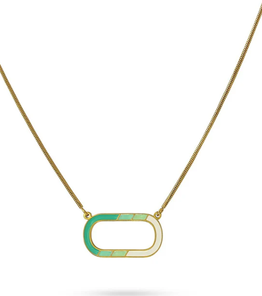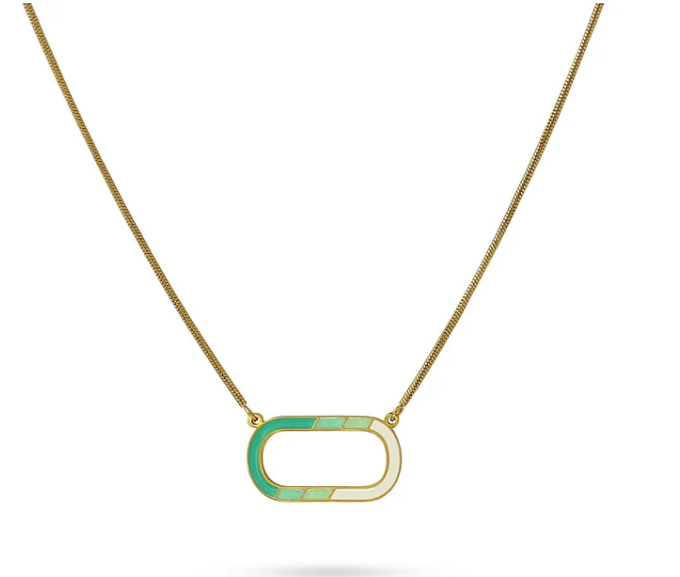 Collar corto con cordón de acero quirúrgico color oro y detalle central ovalado esmaltado en colores pastel. Original y versátil. Mide 40 cm de largo y lleva cierre tipo langosta y cadena de extensión. Hipoalergénico.