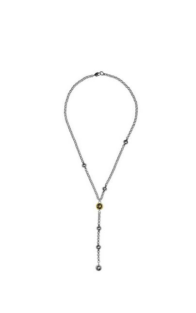 El Collar Kermes Gold es un collar largo estilo corbatero con cadena de eslabones bañada en plata. Combina motivos de esferas en metal con baño de plata u oro. Con cierre de mosquetón y longitud de 80 cm, es un collar versátil y sofisticado que aporta dinamismo y estilo contemporáneo a cualquier look.