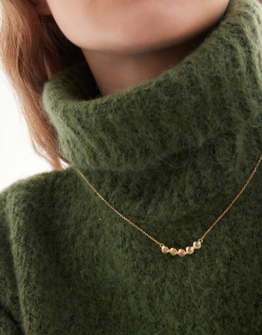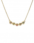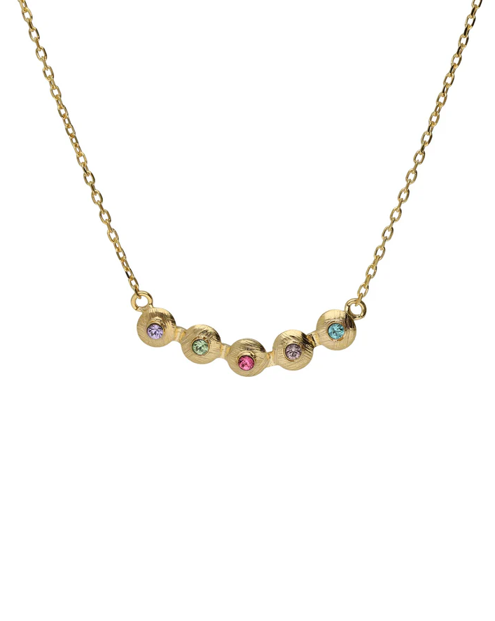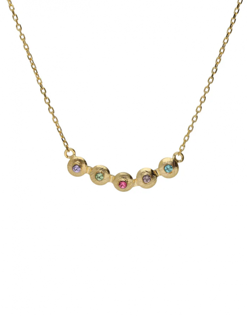 Collar corto con cristal multicolor de Plata de Ley bañada en Oro de 18kt. Tamaño del motivo de 2,8cm x 0,5cm en forma de círculo. Tamaño del cristal 0,2cm. Largo de 40-45cm con cierre reasa y cadena diamantada de la colección Bruma