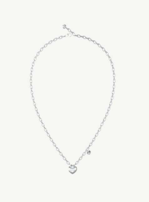 Collar de acero para mujer de la marca Guess. Cadena plateada de eslabones con motivo central de doble corazón entrelazado con logo Guess grabado y corazón mini de cristal blanco a un costado. Sumérgete en la pasión y el encanto de Crazy in Love, donde corazones entrelazados y pavé de cristales se unen para crear piezas que irradian amor y sofisticación.