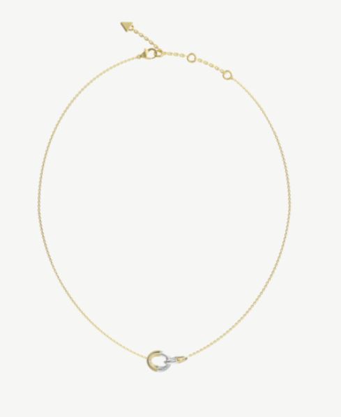 Collar de acero para mujer de la marca Guess. Collar dorado de cadena con eslabón como icono central, bicolor y decorado con pedrería. Un diseño diferente de cadena y eslabones convierte esta colección en algo único y espectacular. Para deslumbrar en cualquier situación.