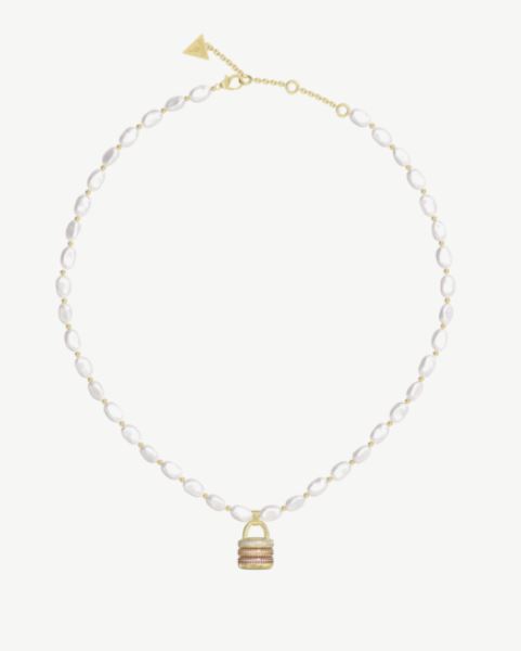 Collar de acero para mujer de la marca Guess. Collar de perlas de formas orgánicas con candado colgando recubierto de piedras de diferentes colores. Símbolo del amor, el candado se rediseña para ser la pieza central de la elegante colección Guess My Secret de la marca americana.