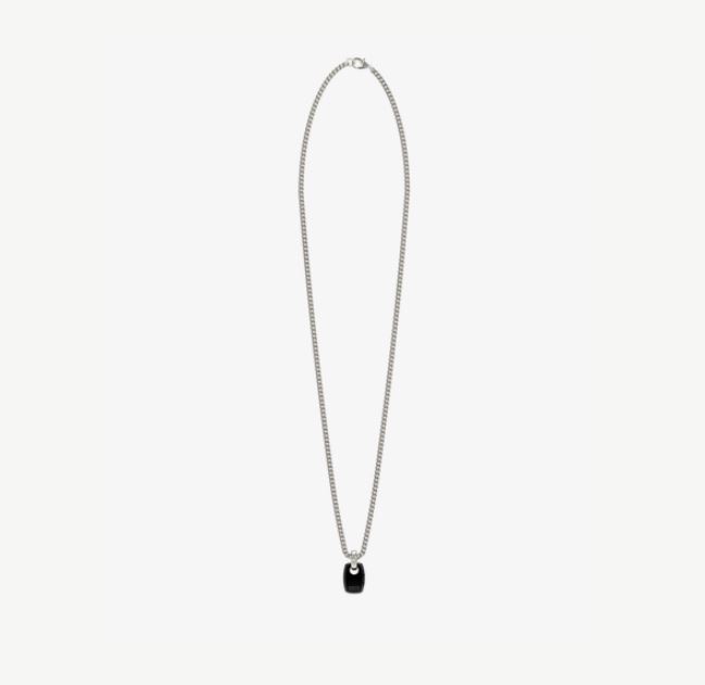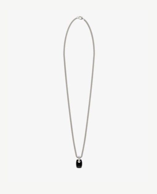 Collar de acero para hombre de la marca Guess. Cadena plateada con motivo central de placa negra con logo Guess grabado en la base. Poseidón fusiona cables de acero inoxidable con placas distintivas, creando accesorios que evocan fuerza y majestuosidad. Cada pieza está diseñada para reflejar poder y sofisticación, aportando un toque audaz y contemporáneo al estilo masculino.