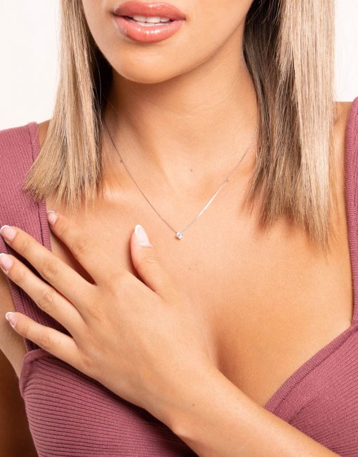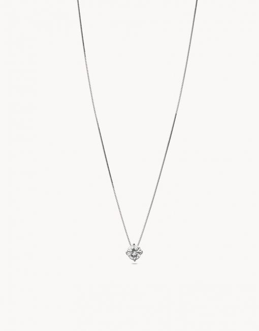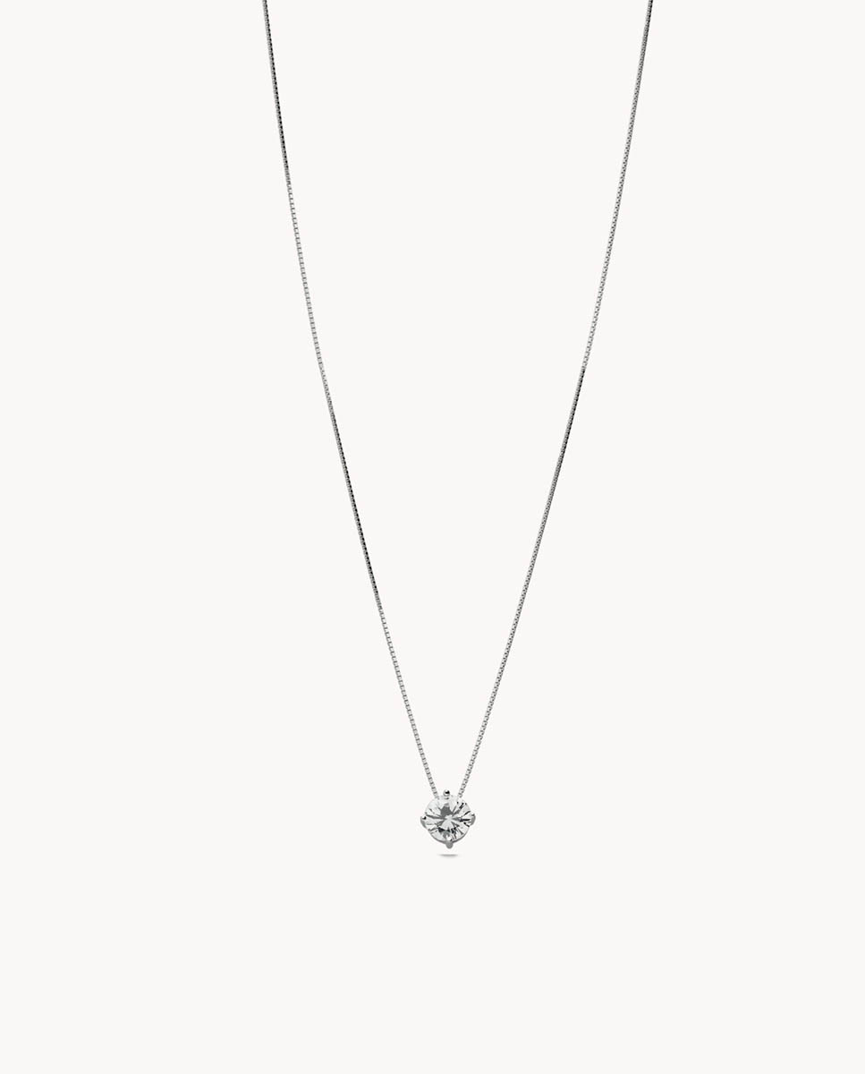 Collar de plata de ley 925 bañada en rodio con colgante de cuatro garras de circonita blanca de 4 mm de diametro, cierre tipo reasa y largo de 42 cms.
