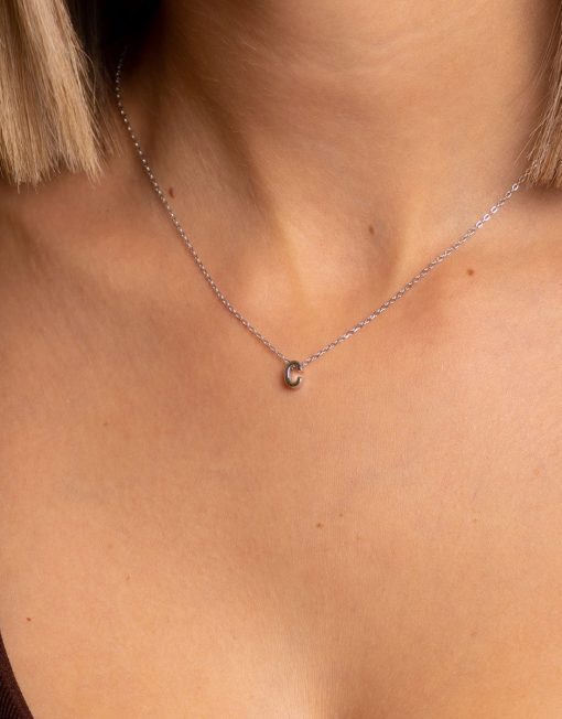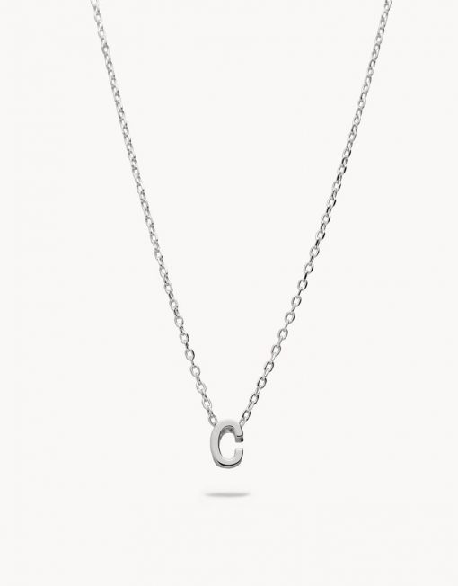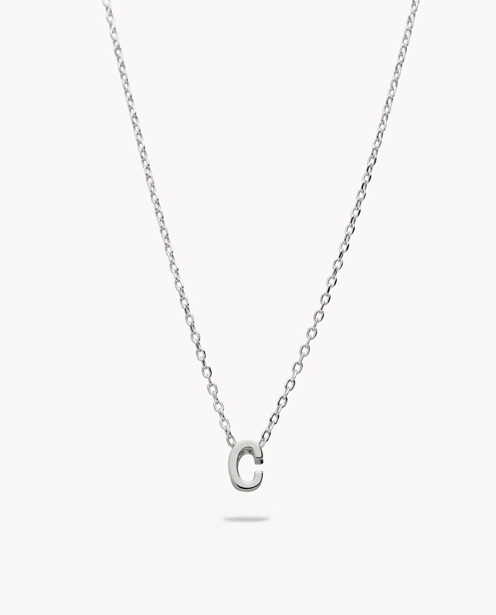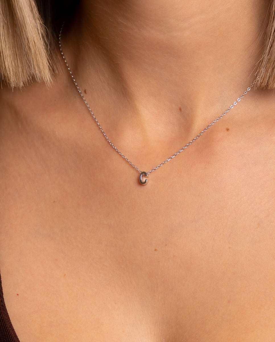 Collar de plata de ley 925 bañada en rodio con inicial C de 7 mm de alto y 3 mm de grosor, cadena de 40 cms más 5 cms de alargador y cierre de mosquetón.
