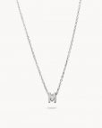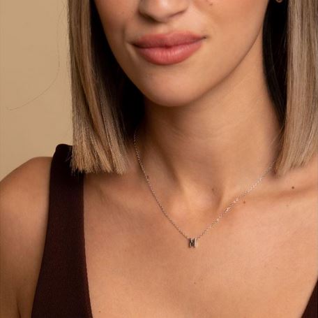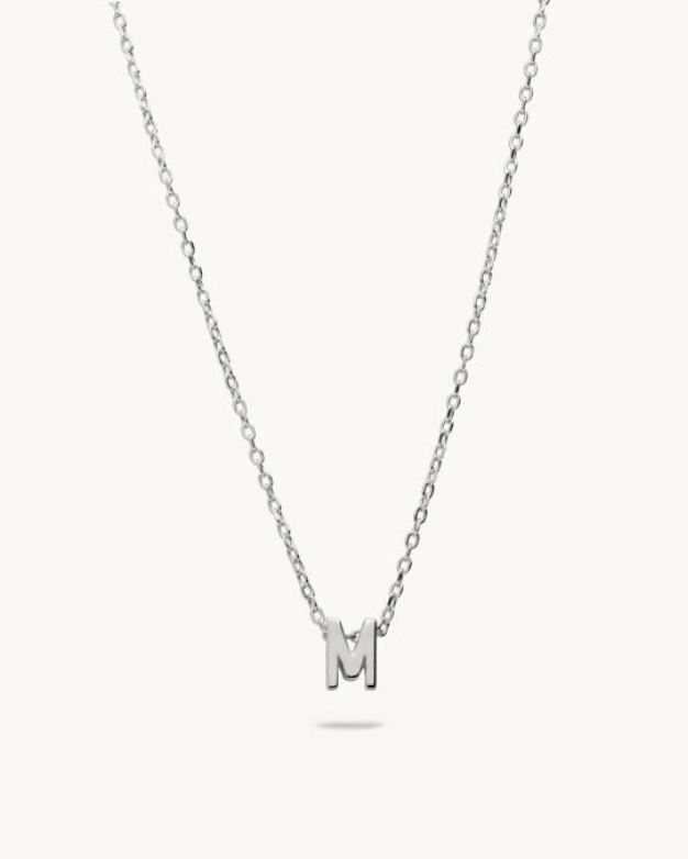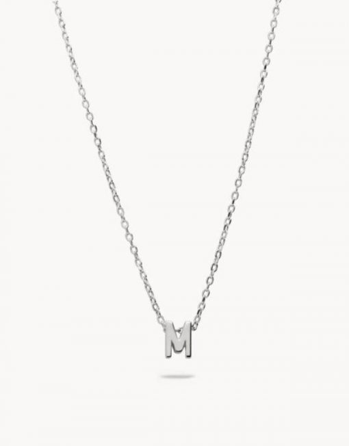 Collar de plata de ley 925 bañada en rodio con inicial M de 7 mm de alto y 3 mm de grosor, cadena de 40 cms más 5 cms de alargador y cierre de mosquetón.