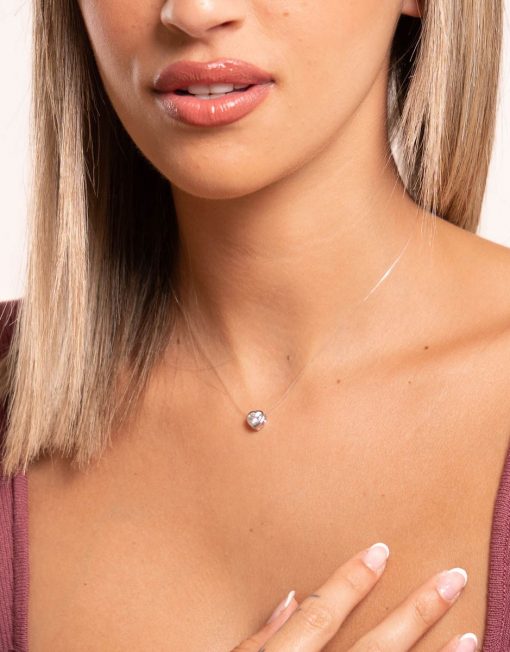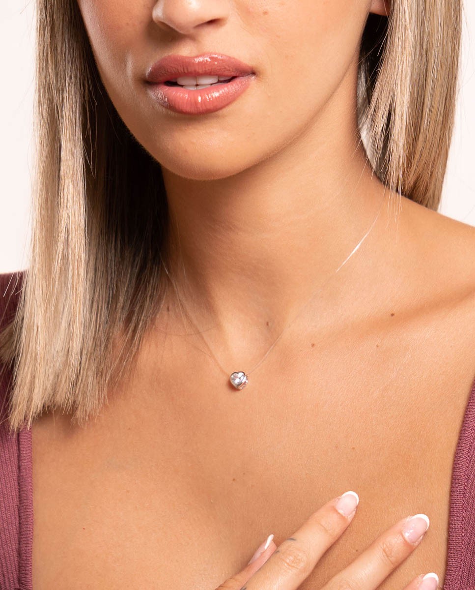 Collar de plata de ley 925 bañada en rodio de tanza invisible con corazón de 6 mm x 6 mm (ancho por alto) y circonita blanca en su interior, cierre tipo reasa y largo de 38 cms más 5 cms de alargador.